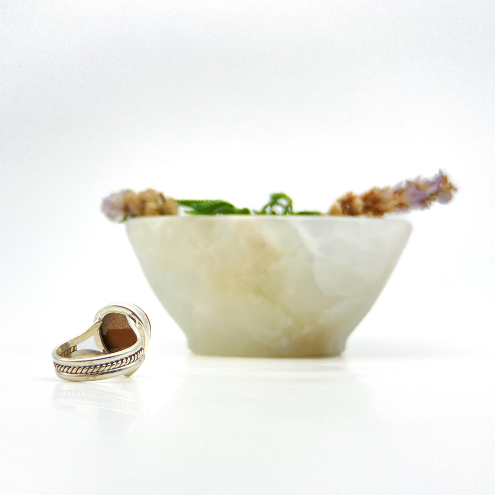 Anillo con un bello ejemplar de cuarzo jaspe, abundante en la superficie terrestre, por lo que logra recrear paisajes en sus formas y colores.