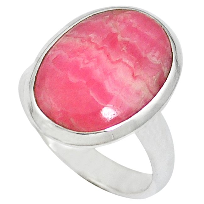 Anillo con rodocrosita, mineral considerado “delicado” que se presenta en una gama de hermosos tonos rosados a rojos. Se considera la piedra nacional de Argentina.