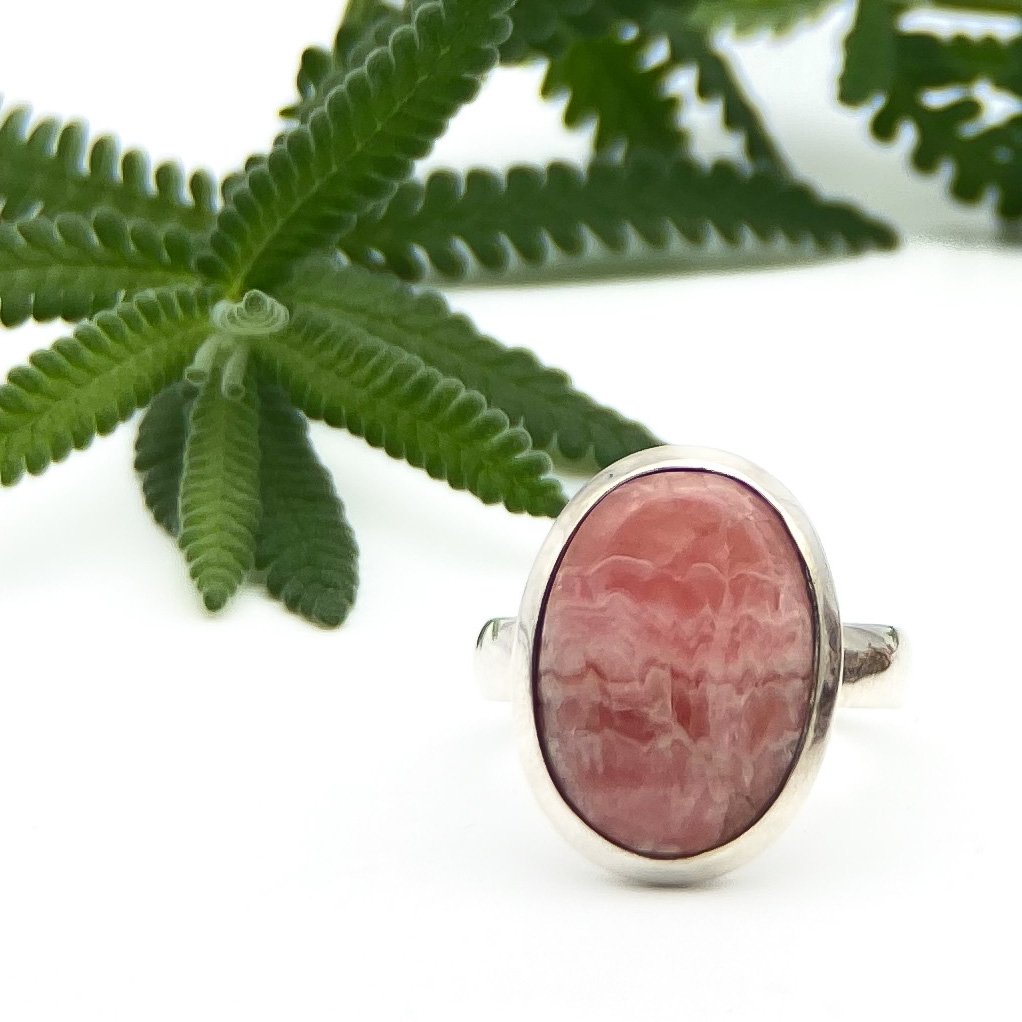 Anillo con rodocrosita Talla 6.5. El trabajo de montaje de las piedras se hace con cuidado y detalle en el taller para que luzcan su esplendor.