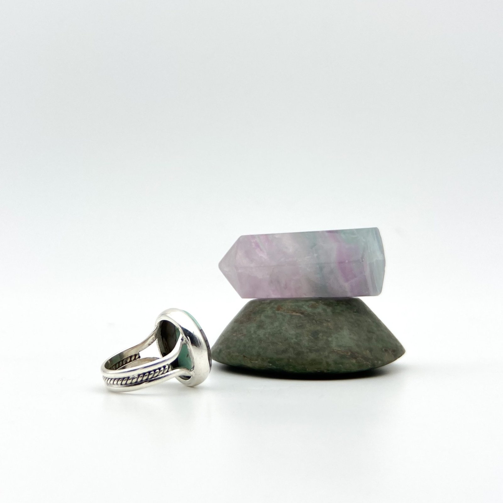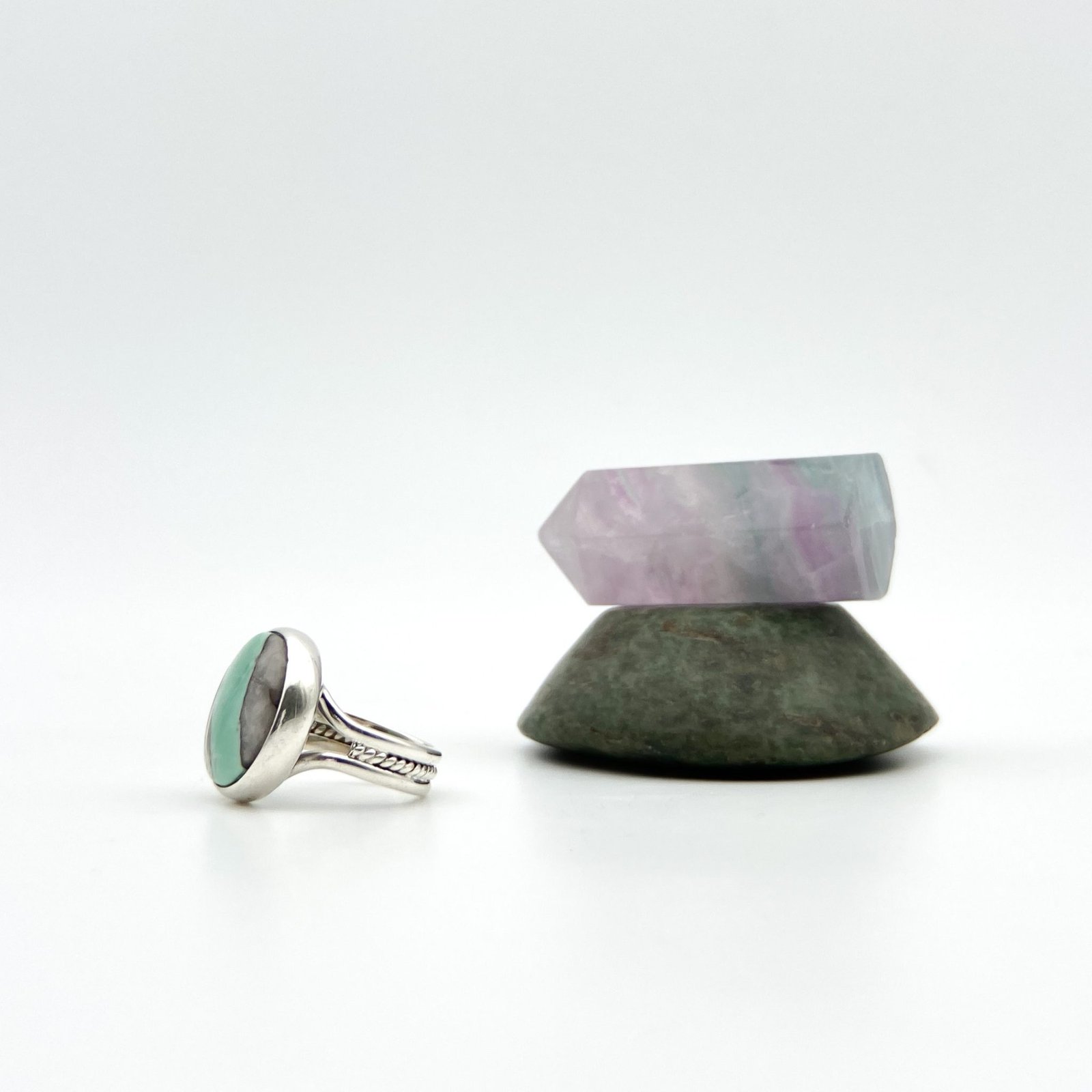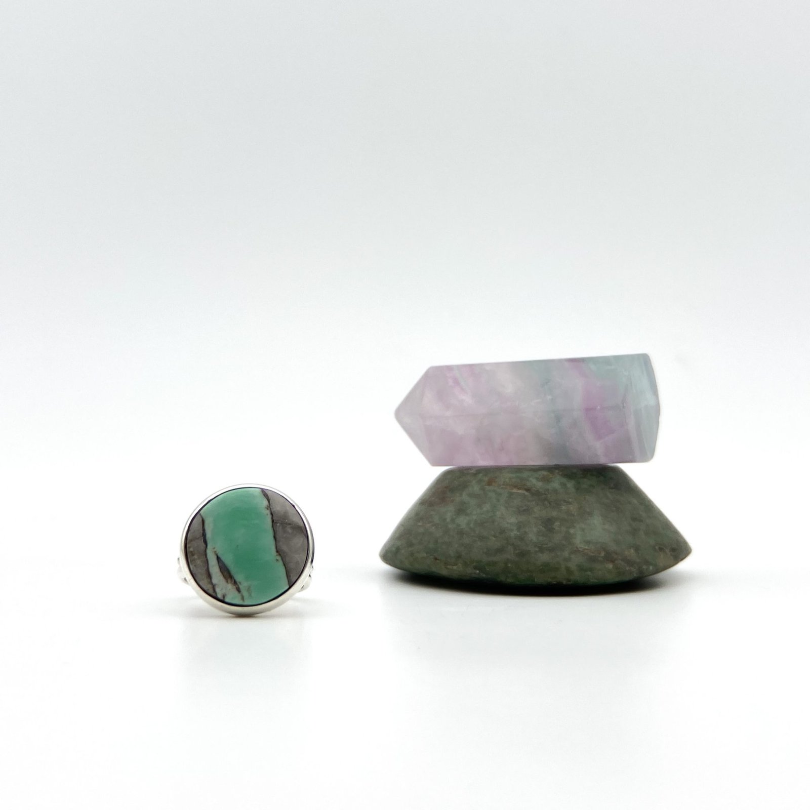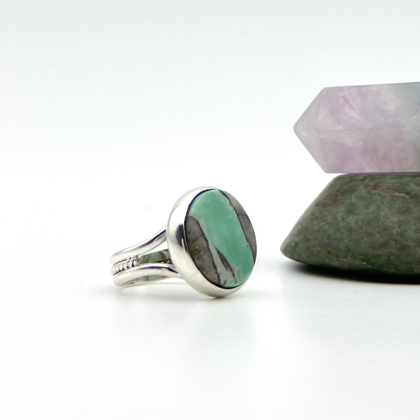 Anillo con variscita Talla 5.5. El trabajo de montaje de las piedras se hace con cuidado y detalle en el taller para que luzcan su esplendor.