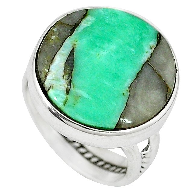 Anillo con variscita, raro mineral que generalmente es de color verde, del cual presenta una gama que puede ir desde el verde amarillento al verde azulado.