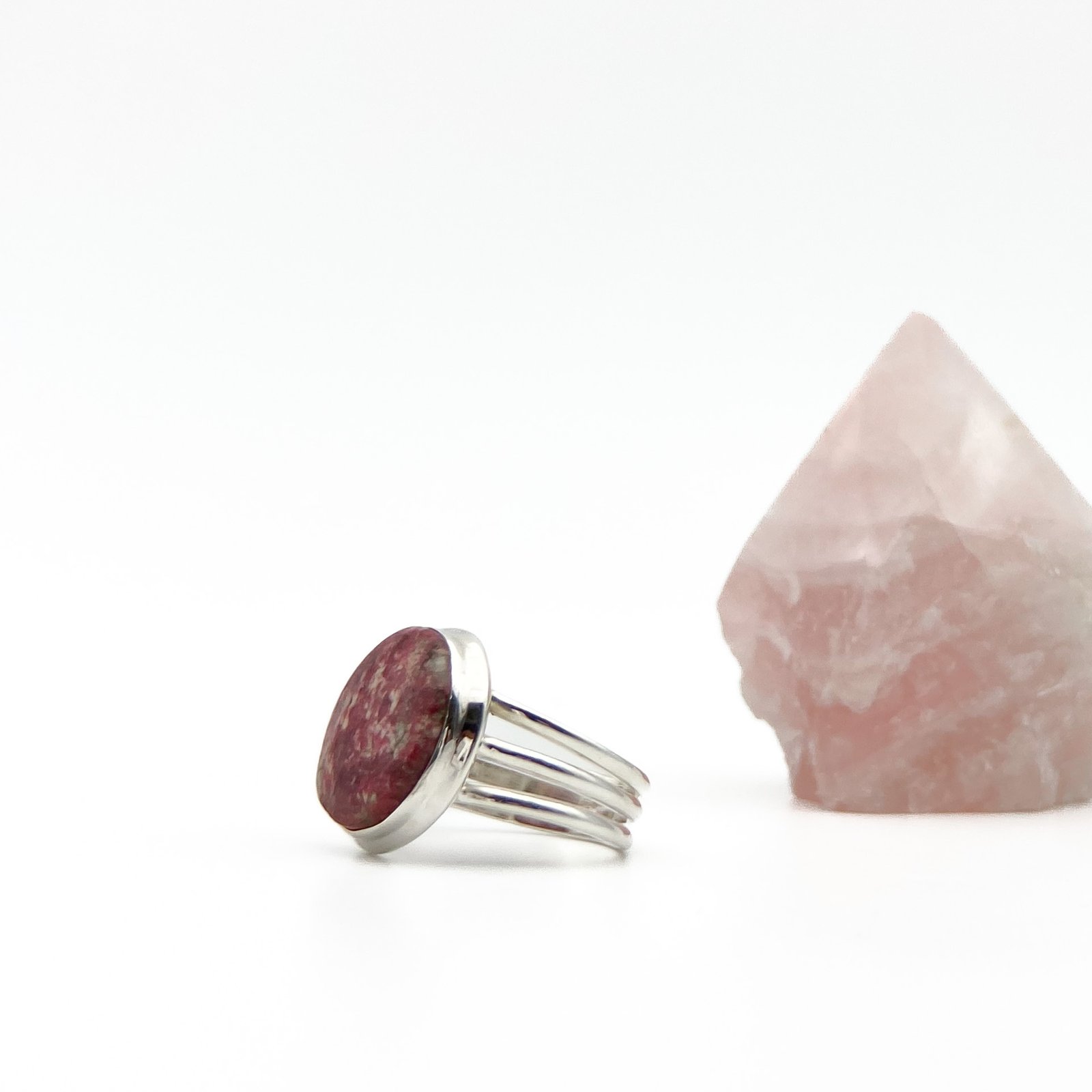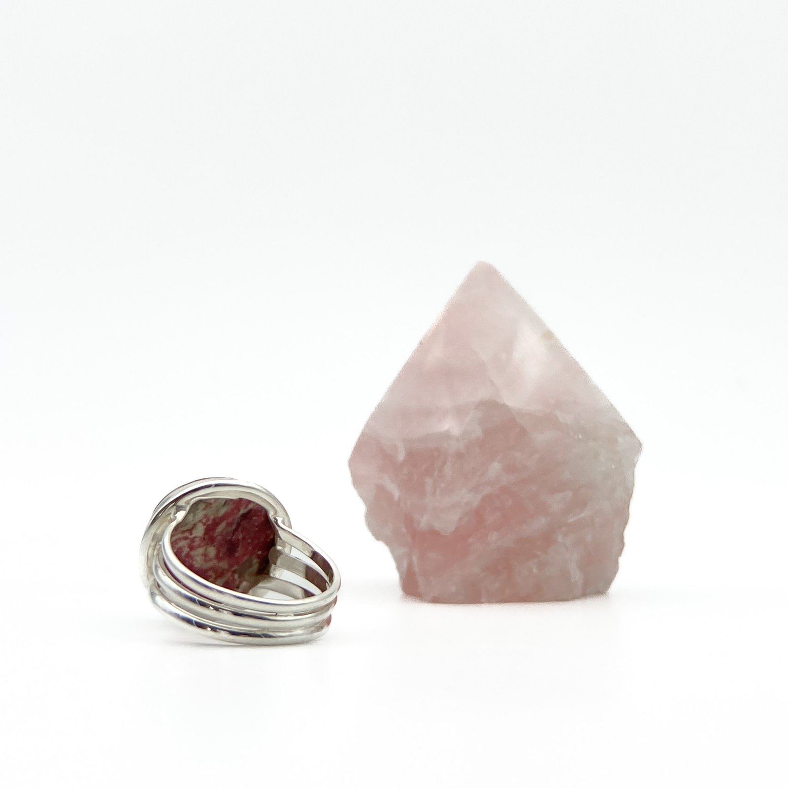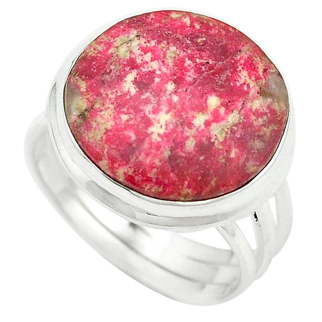 Anillo con zoisita, la cual no es una sola piedra, sino todo un conjunto de éstas. Una de sus principales características es que puede tener variados y hermosos colores como el azul y, en este caso, el rosa.