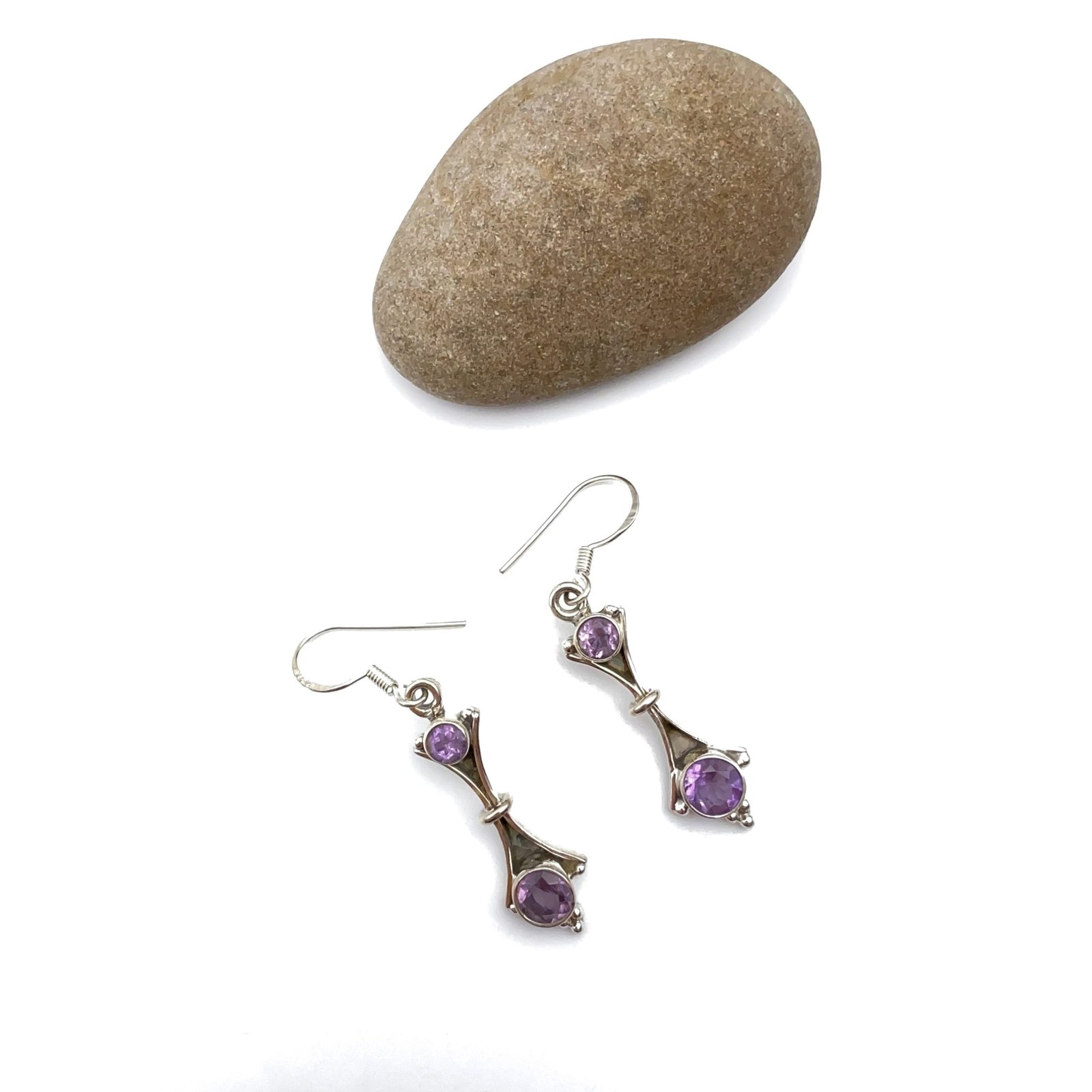 Aretes con dos amatistas. El trabajo de montaje de las piedras se hace con cuidado y detalle en el taller para que luzcan su esplendor en conjunto con la plata Sterling.