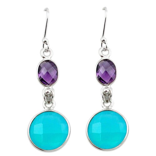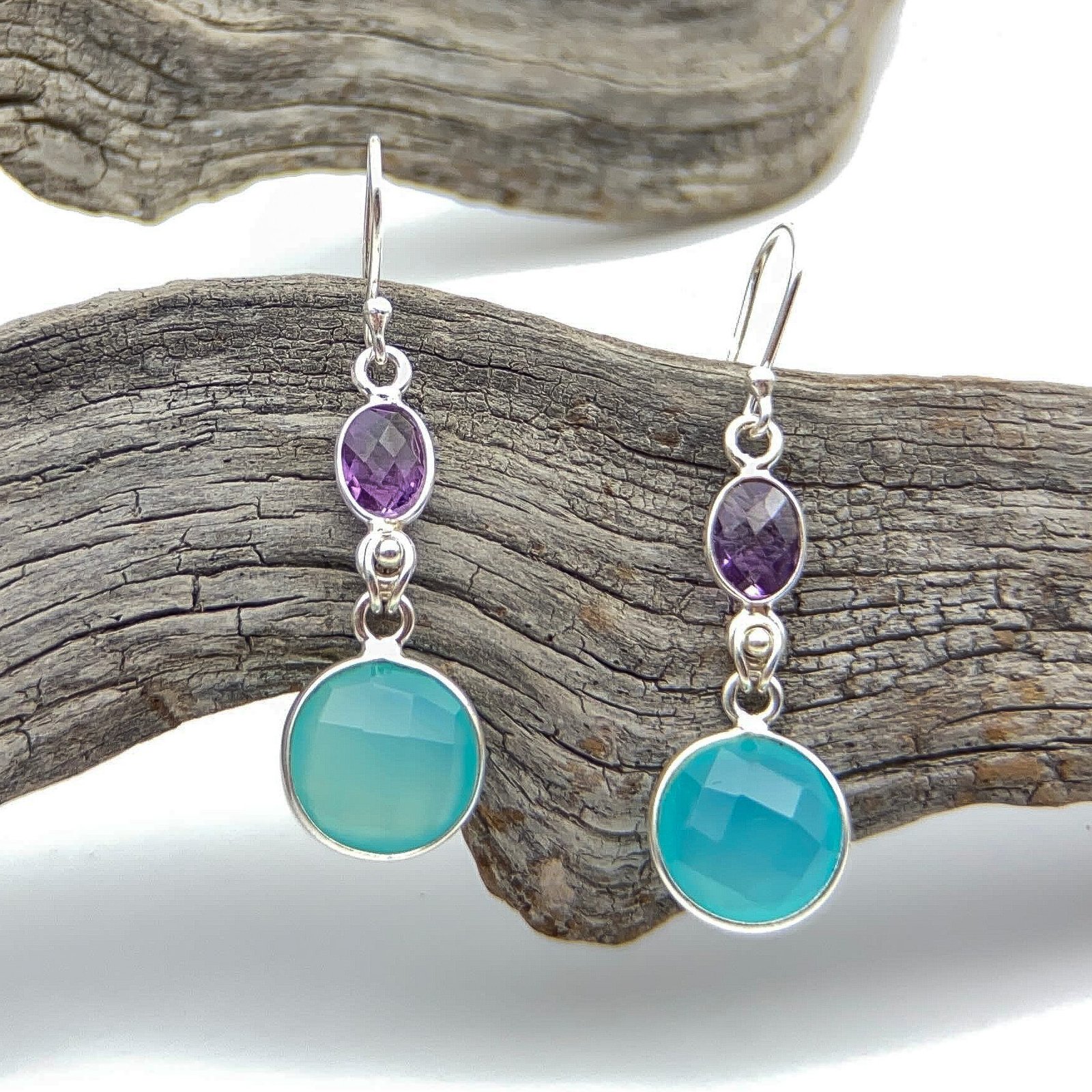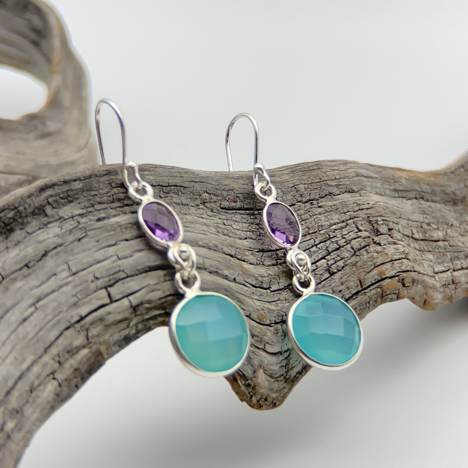 Aretes con calcedonia y amatista. El trabajo de montaje de las piedras se hace con cuidado y detalle en el taller para que luzcan su esplendor.