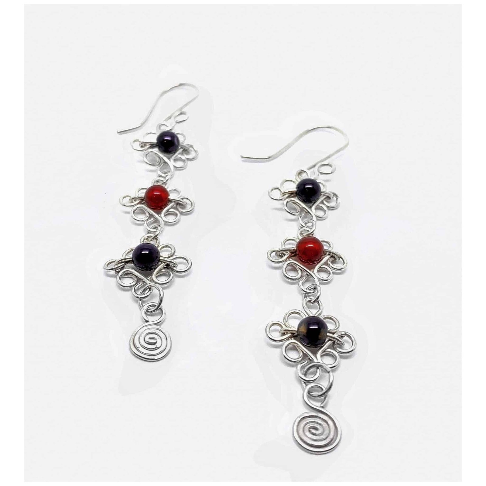 Aretes de plata Sterling Ley 925 con piedras ónix y cornalina naturales, elaborados artesanalmente mediante la técnica del alambrismo.