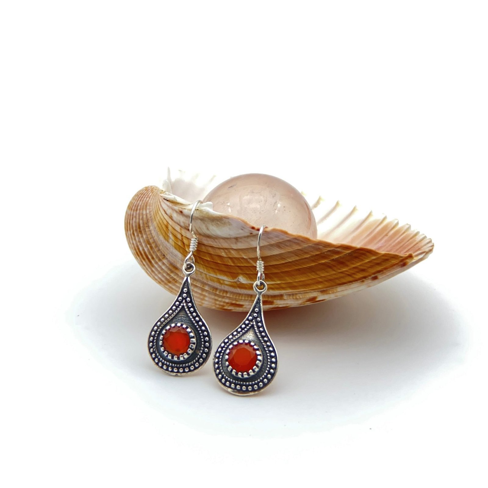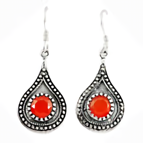 Aretes en forma de gota con cornalina trabajo tipo Hindú. El trabajo de montaje de las piedras se hace con cuidado y detalle en el taller para que luzcan su esplendor en conjunto con la plata Sterling.