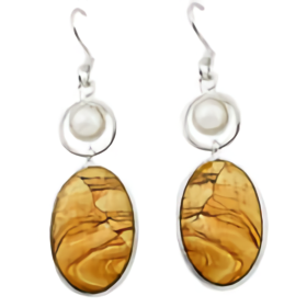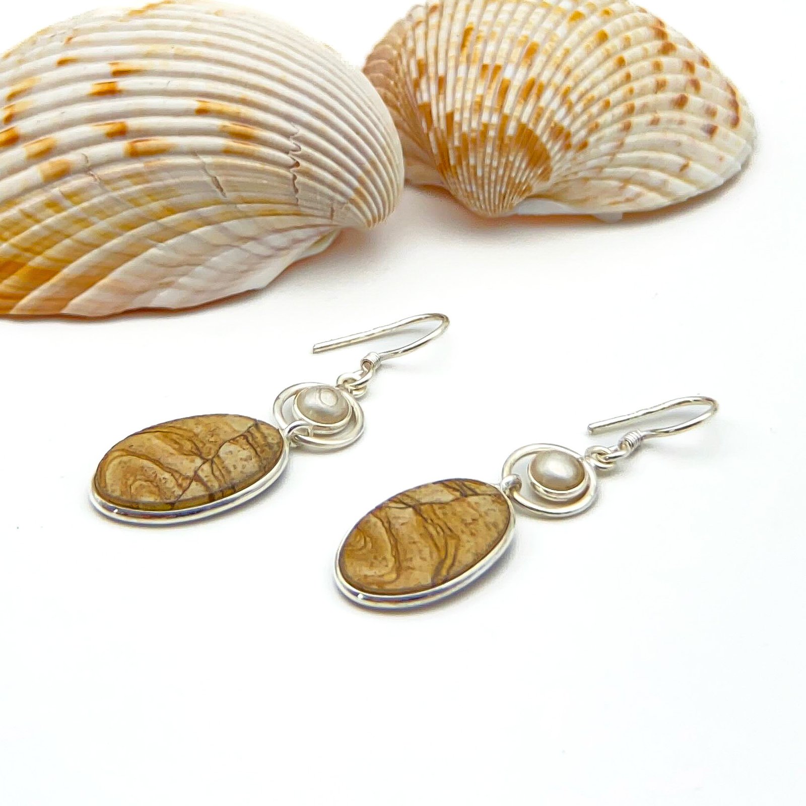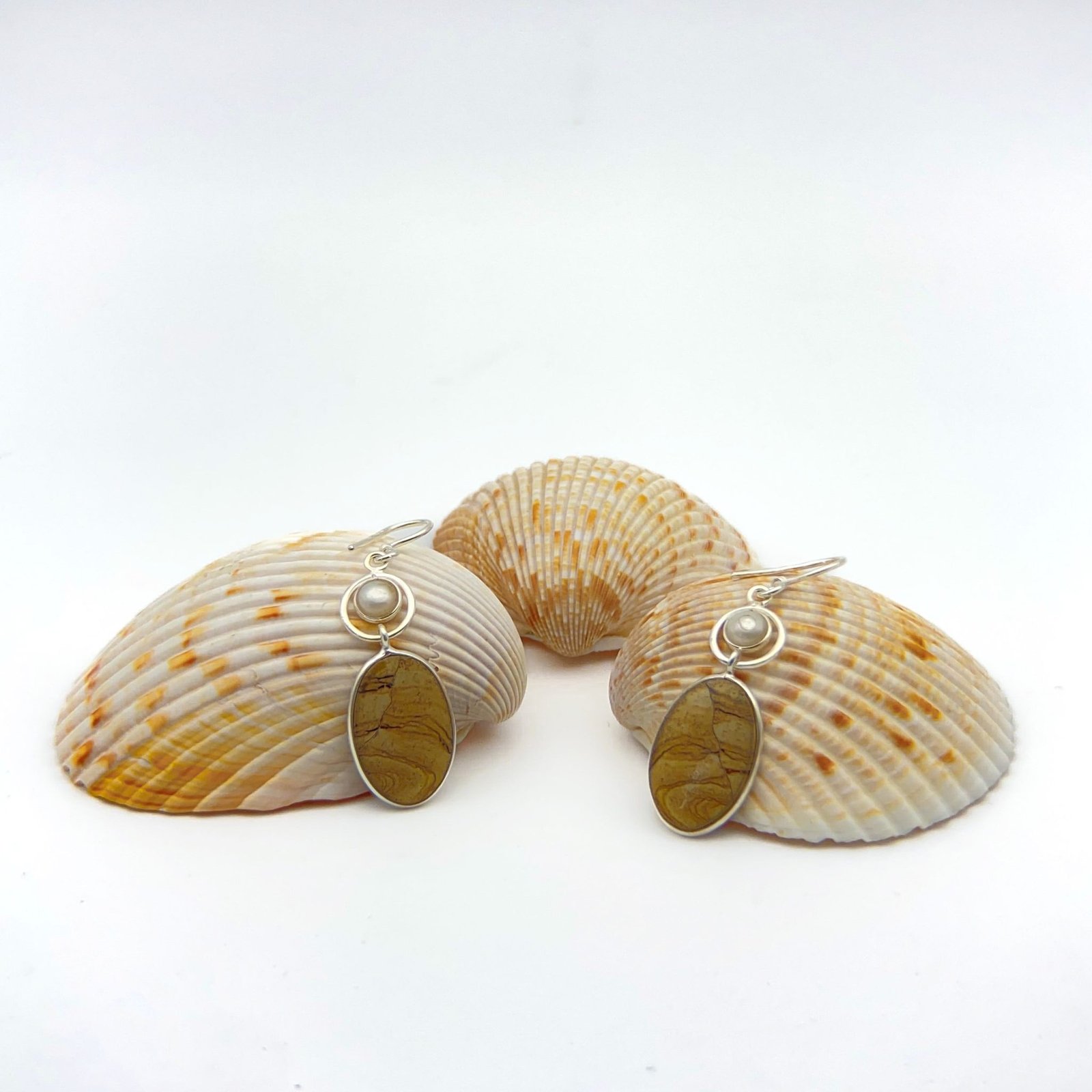Aretes con jaspe, tipo de cuarzo abundante en la superficie terrestre que captura paisajes en sus formas y colores; y por otro lado, las perlas, que son tesoros marinos cuyo origen son las entrañas de los moluscos.