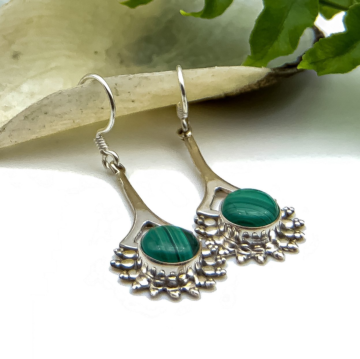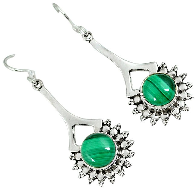 Aretes con malaquita, mineral que surge a partir del cobre, cuyo color verde esmeralda altamente resistente al desgaste es muy cotizado en todo el mundo.