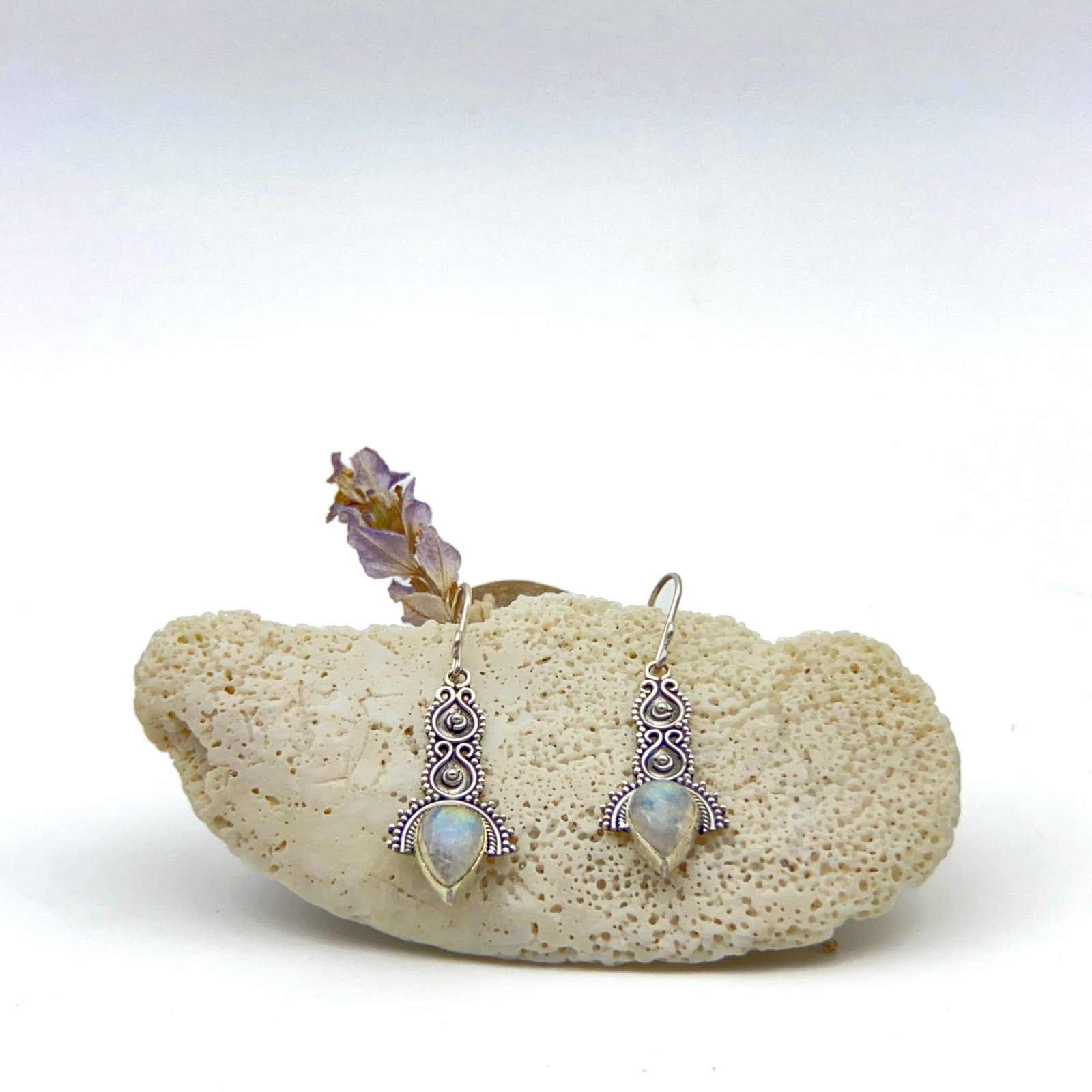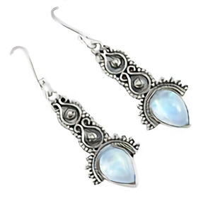 Aretes inspirados en la estética de la cultura india en los que se luce la piedra luna, una gema única ya que refleja la luz de una manera casi mística.