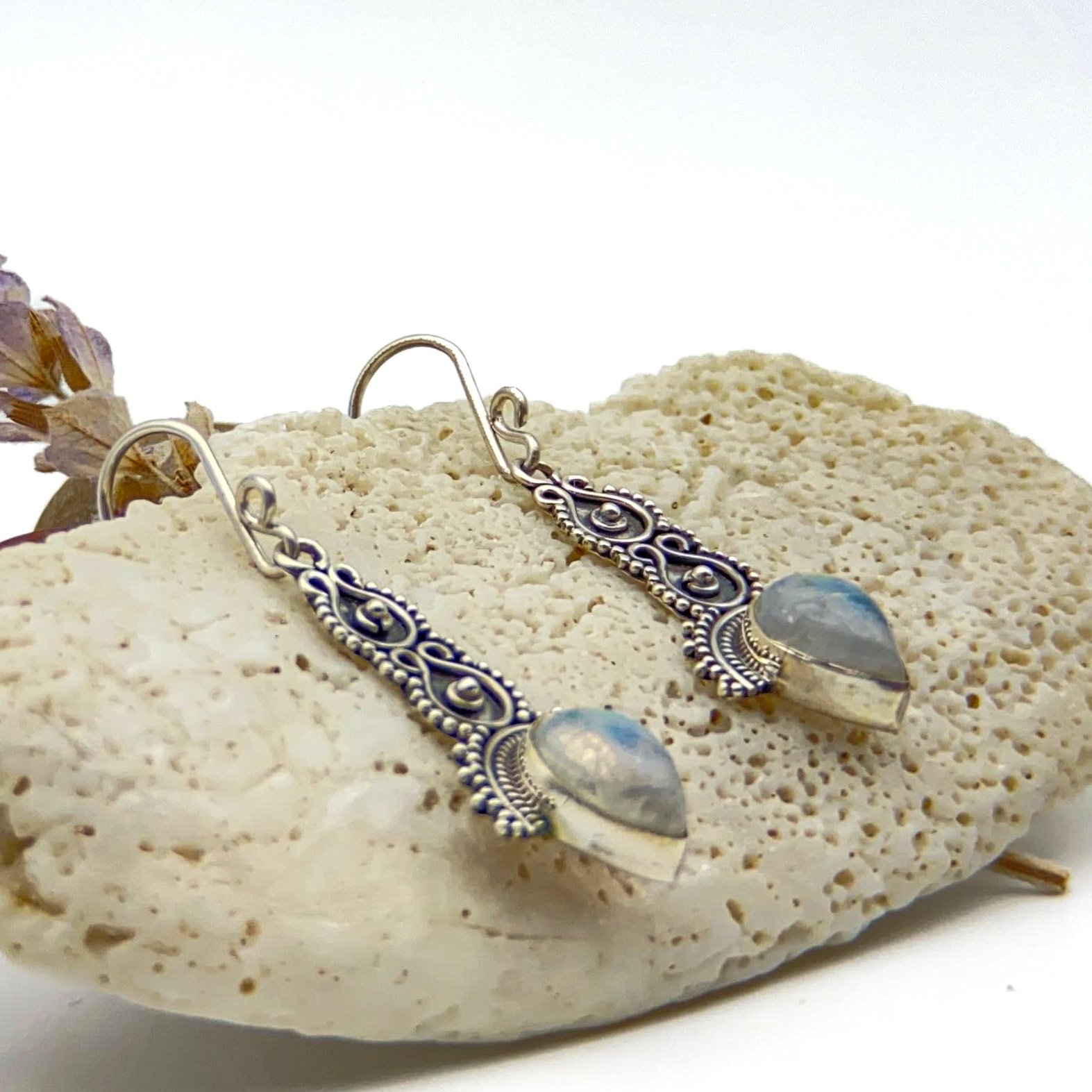 Aretes con piedra luna coronada, trabajo tipo hindú. El trabajo de montaje de las piedras se hace con cuidado y detalle en el taller para que luzcan su esplendor en conjunto con la plata Sterling.