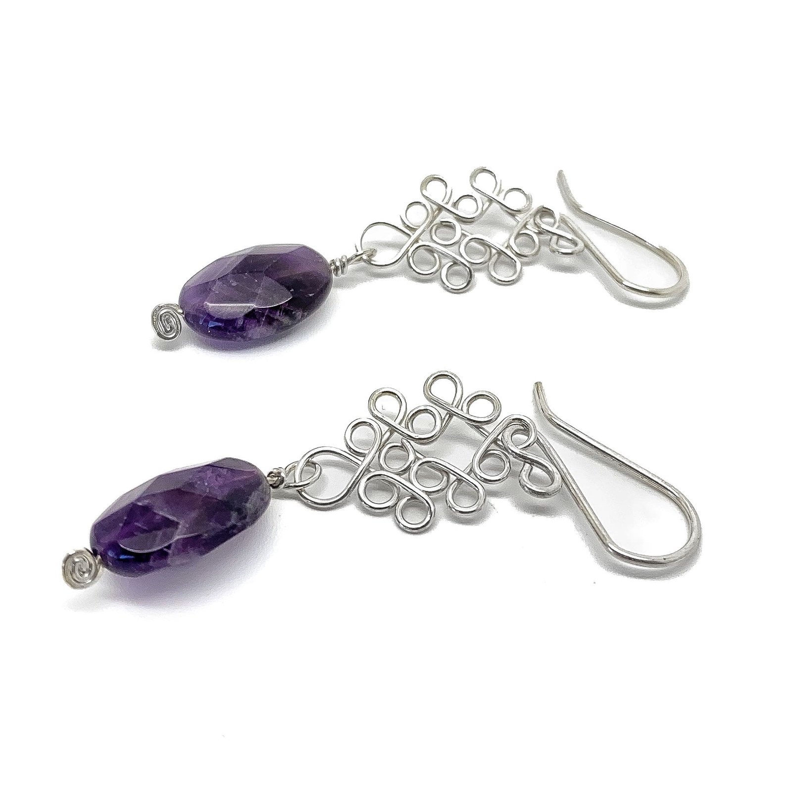 Aretes de plata Sterling Ley 925 con amatistas naturales, elaborados artesanalmente mediante la técnica del alambrismo.