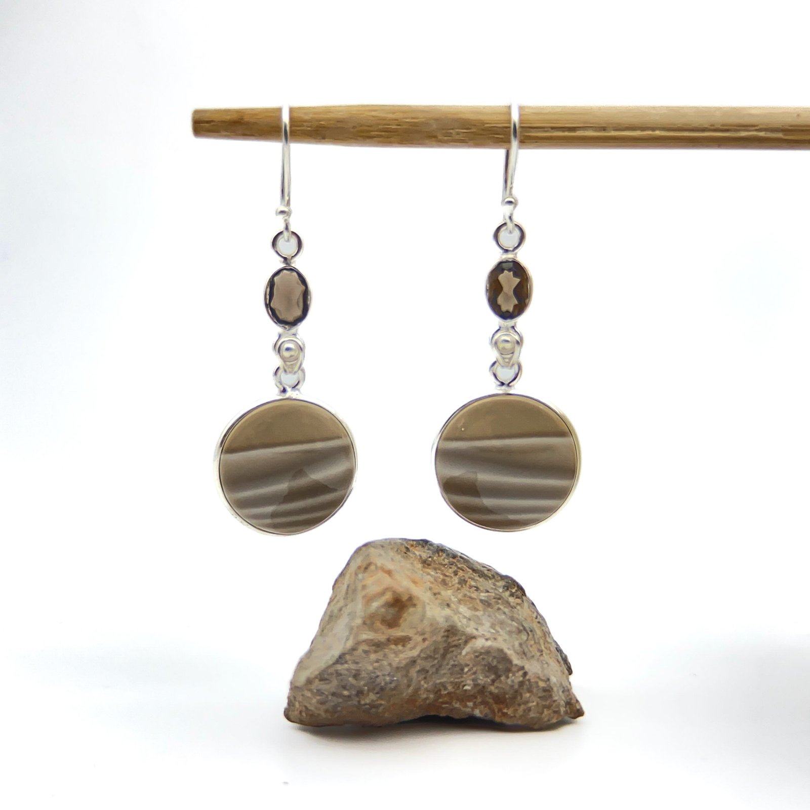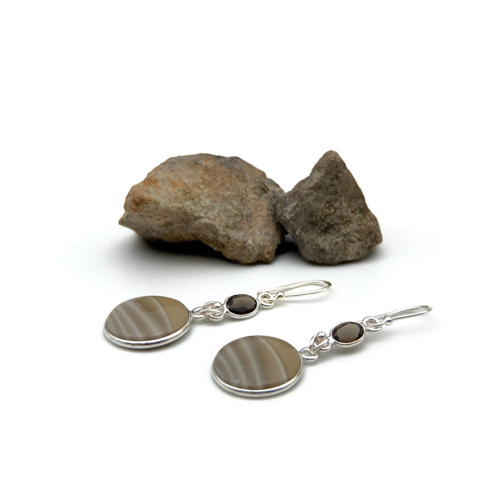 Aretes con sílex y cuarzo ahumado. El trabajo de montaje de las piedras se hace con cuidado y detalle en el taller para que luzcan su esplendor.