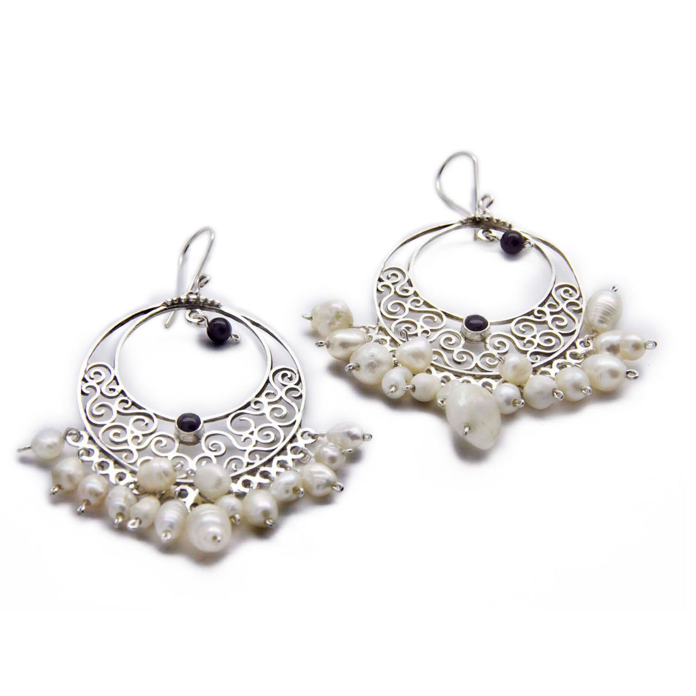 Estas arracadas están inspiradas en los ornamentos que utiliza la comunidad gitana. Siempre llevan perlas junto con la piedra elegida. Versión grande.