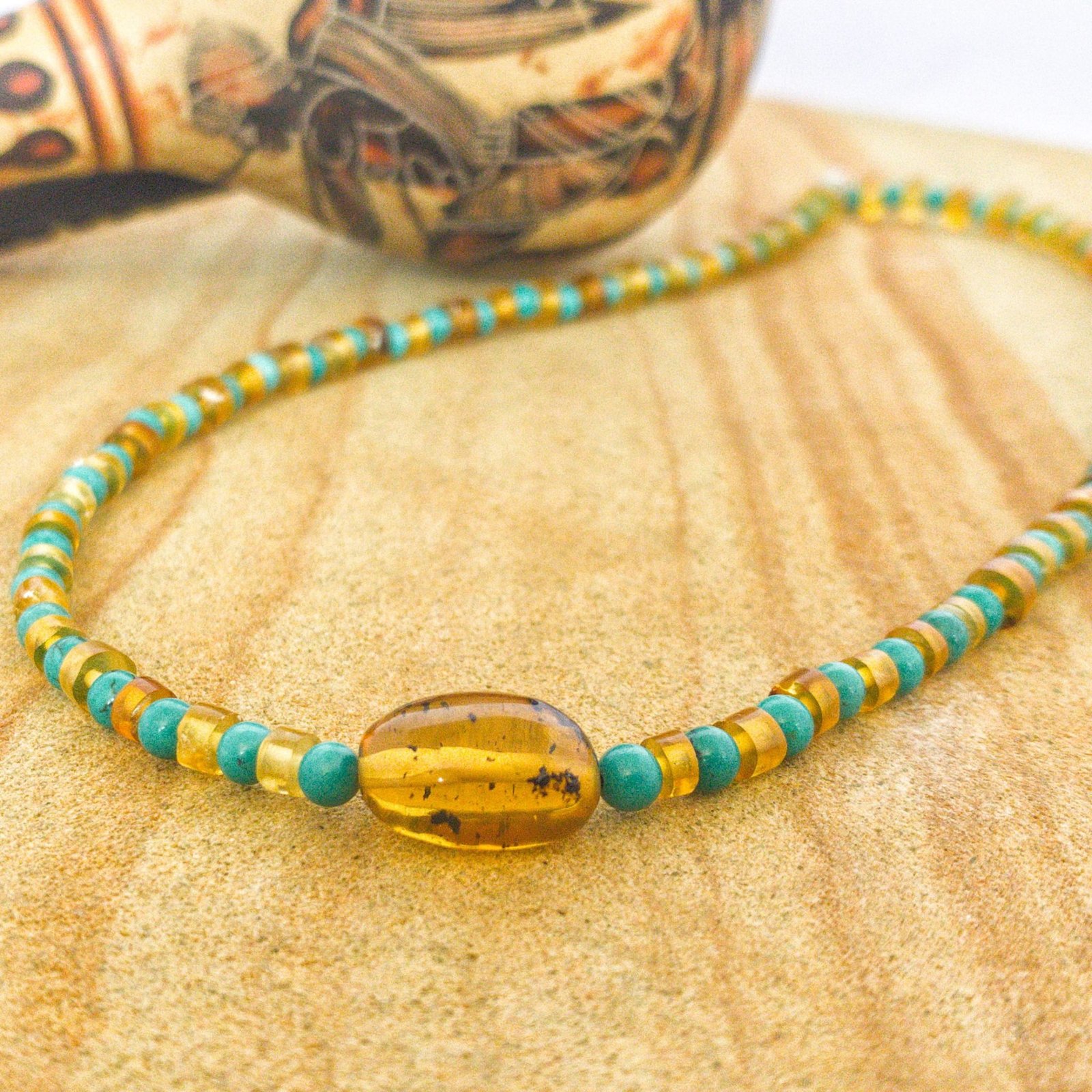 Este collar fusiona el ámbar, que se trata de una resina fósil de al menos 100,000 años de antigüedad; y la turquesa, una de las piedras preciosas opacas más valiosas desde tiempos antiguos.
