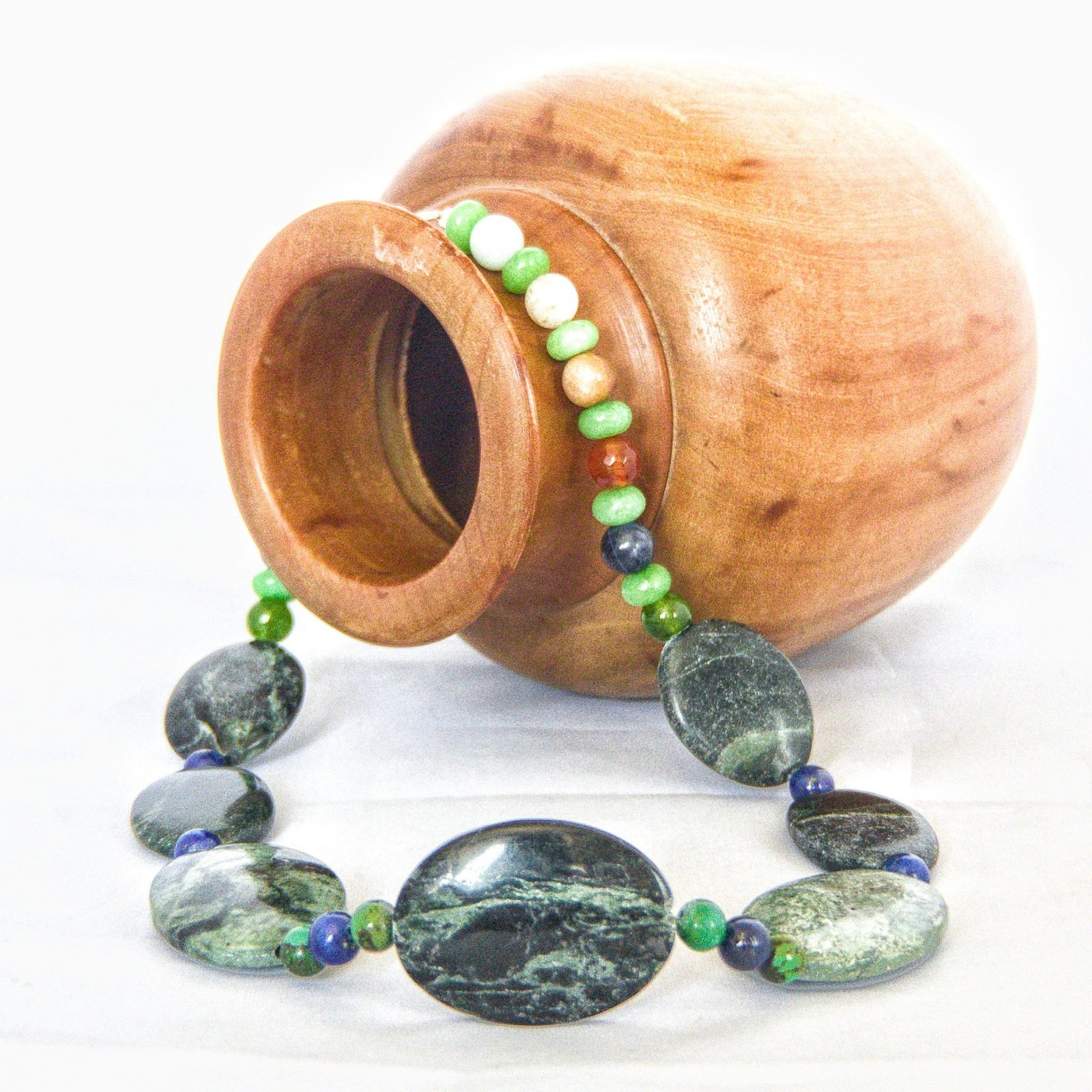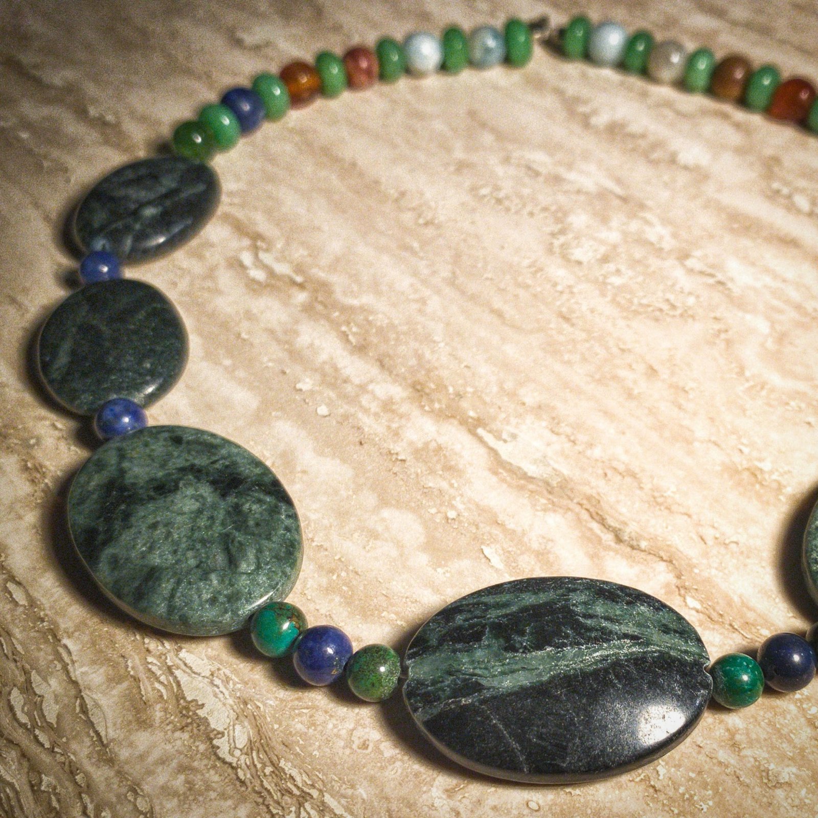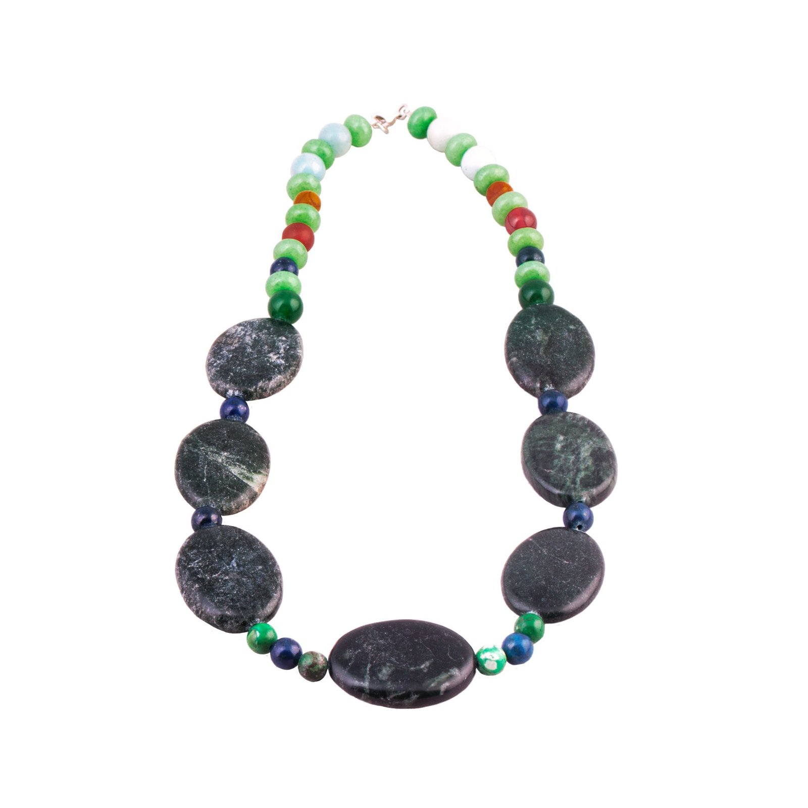 Bello collar multicolor cuyo centro luce siete centros de jade, el cual es una piedra preciosa que fue muy valorada por culturas milenarias como la china y las mesoamericanas.