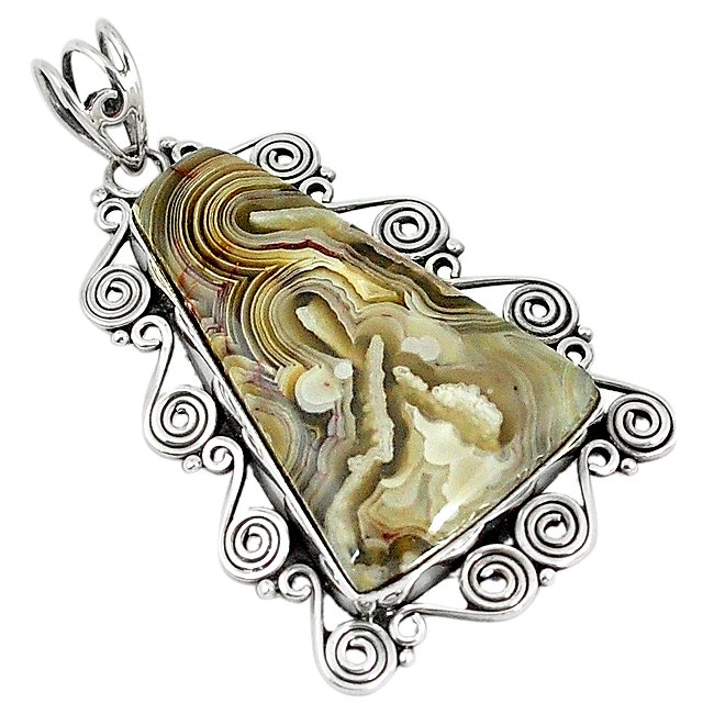Dije con un bello ejemplar de ágata, la cual es la más variada y popular forma de calcedonia. Se presenta en bandas de diferentes colores y transparencias.