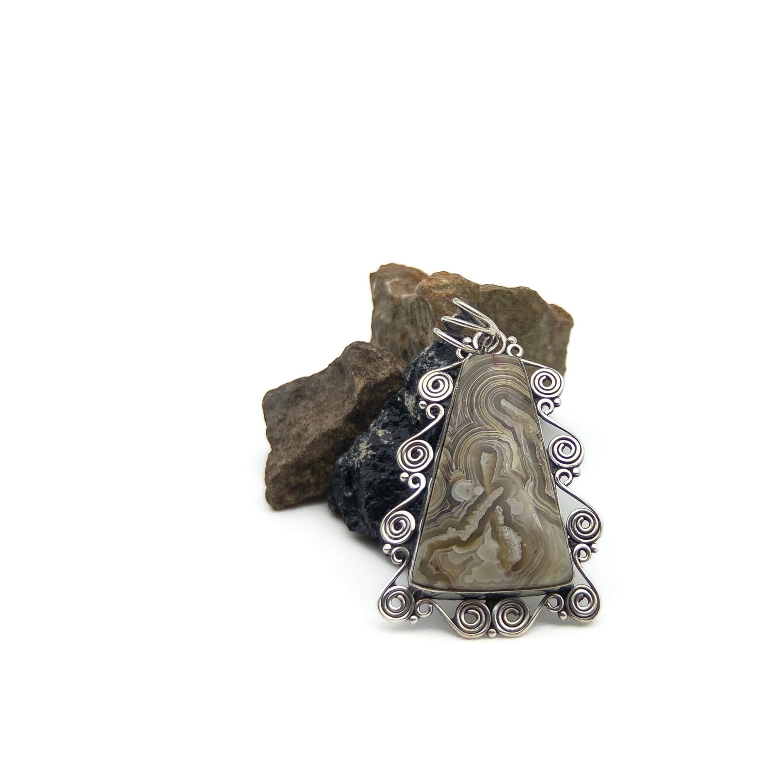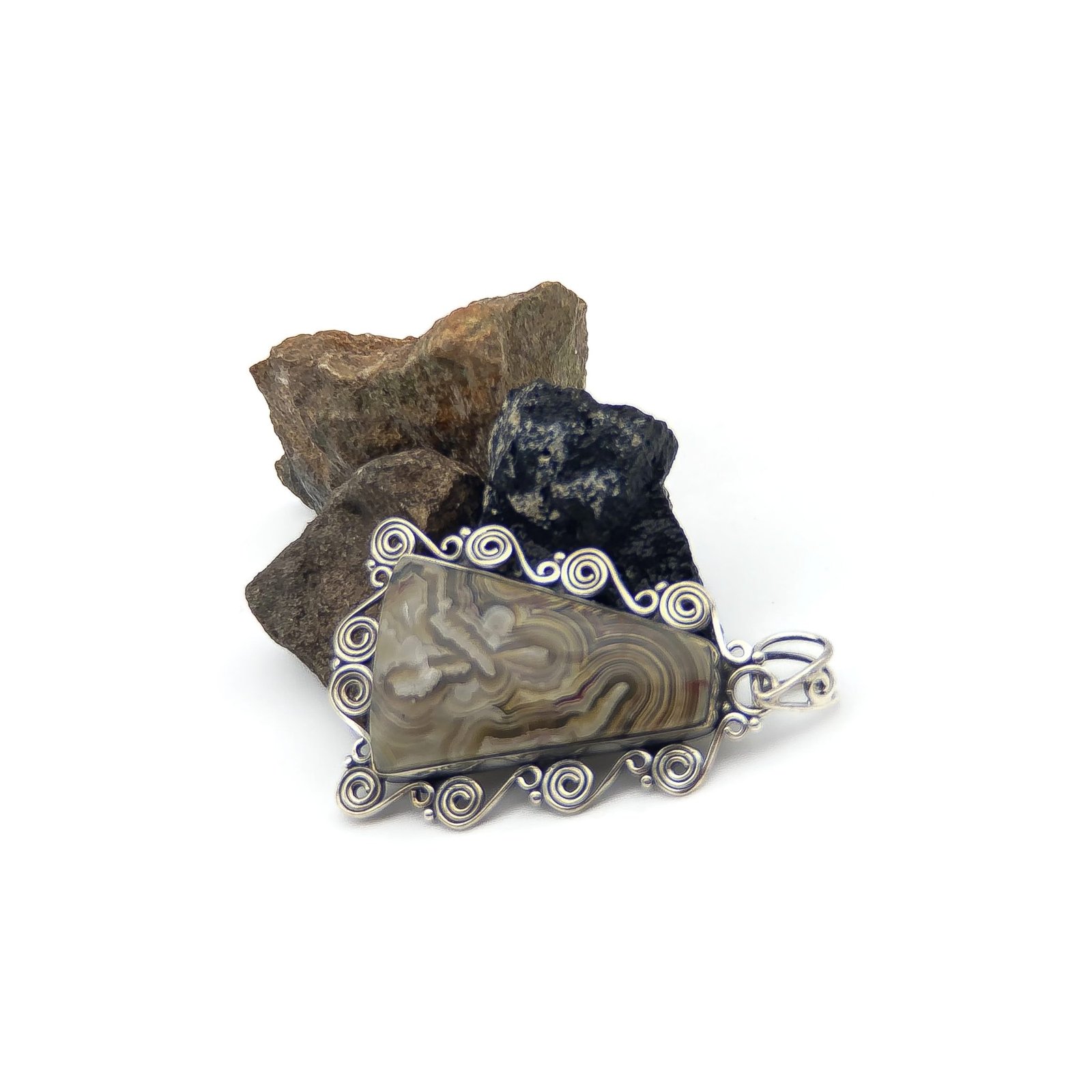 Dije con ágata natural. El trabajo de montaje de las piedras se hace con cuidado y detalle en el taller para que luzcan su esplendor.