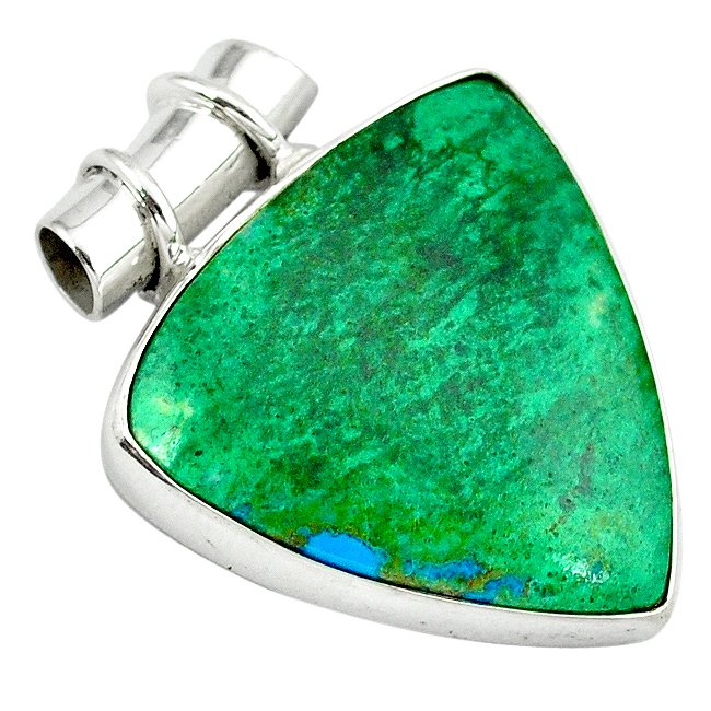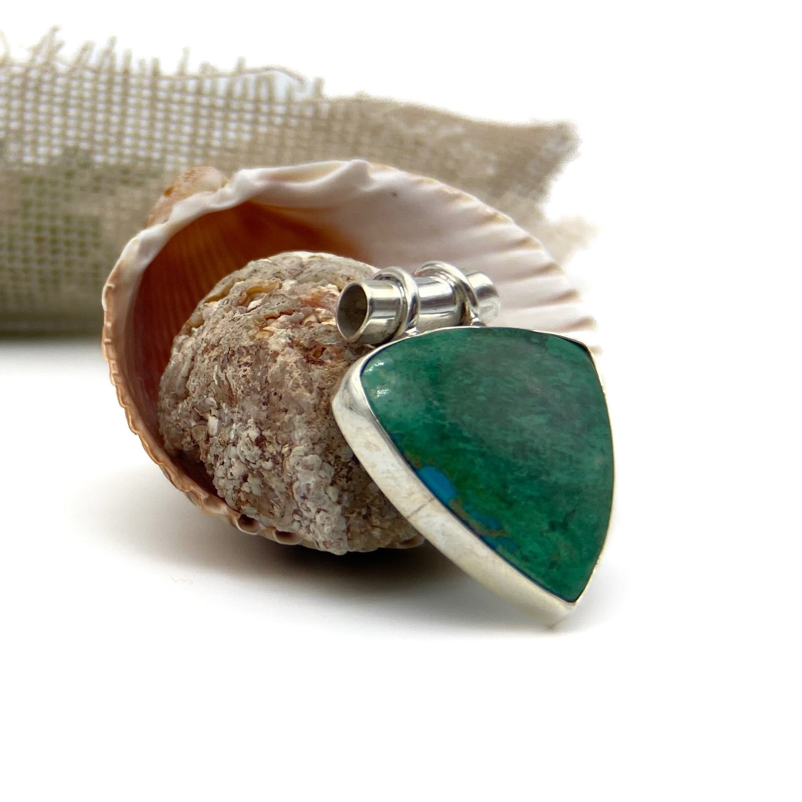 Dije de crisocola, una de las piedras preciosas menos conocidas pero más fascinantes por su combinación de tonalidades verde azuladas, su singular brillo y su rara forma.