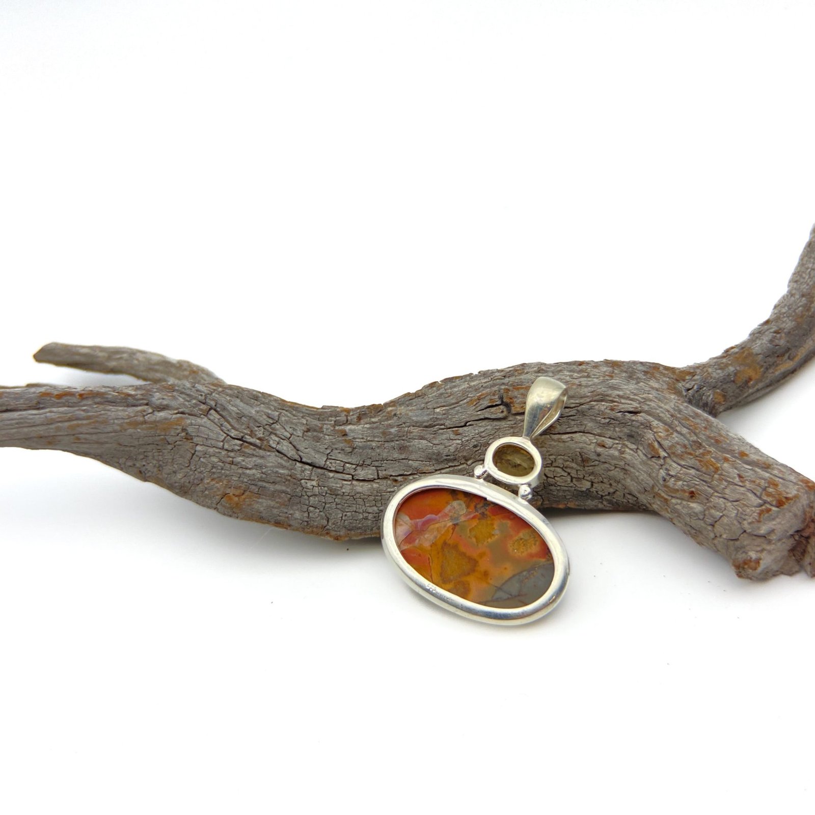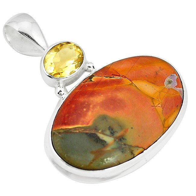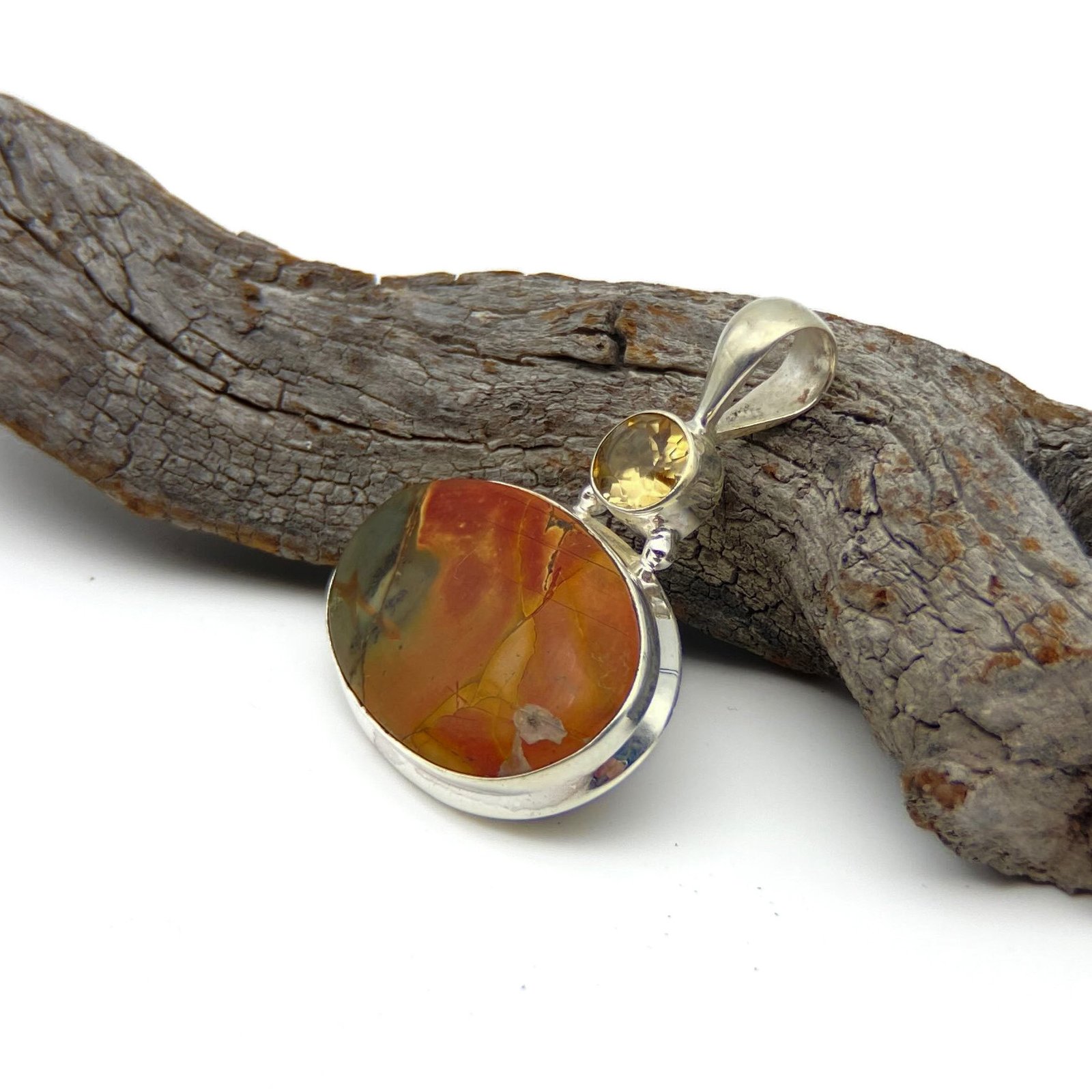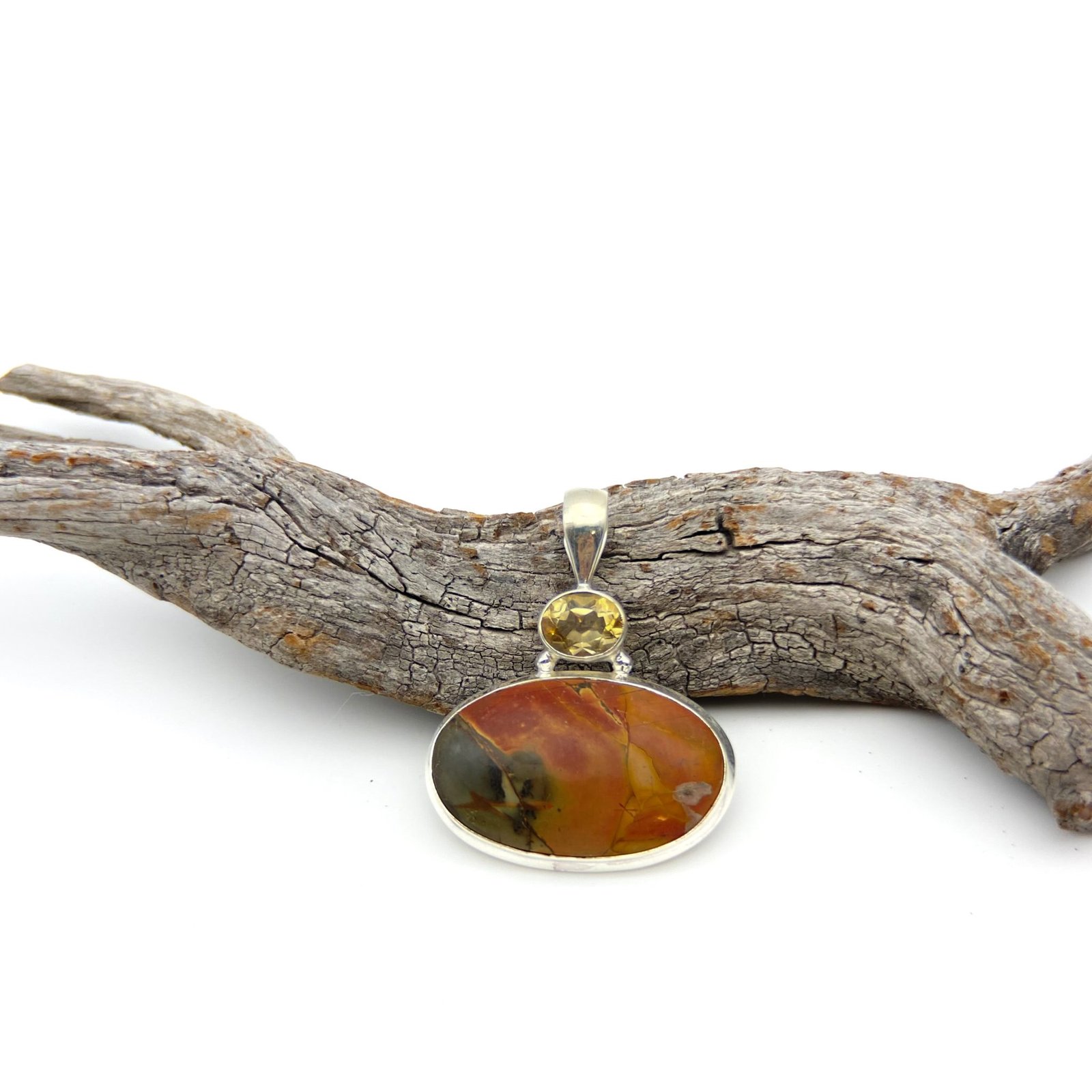 Dije con citrino, una de las piedras semipreciosas más raras del mundo debido a su llamativo color amarillo intenso o anaranjado muy poco común en las variedades del cuarzo; por otro lado, el jaspe es otro tipo de cuarzo que recrea bellos paisajes dentro de sus formas y colores.