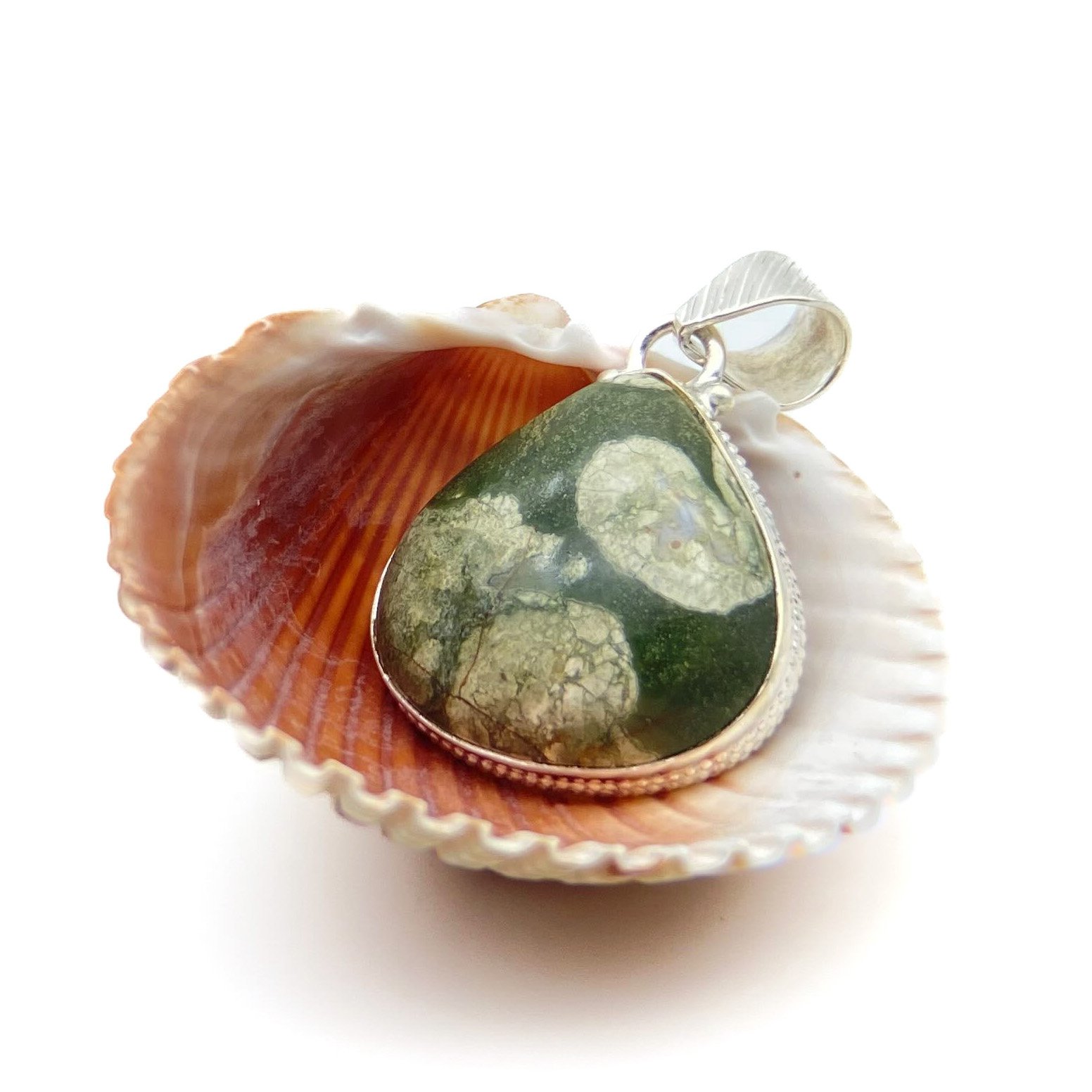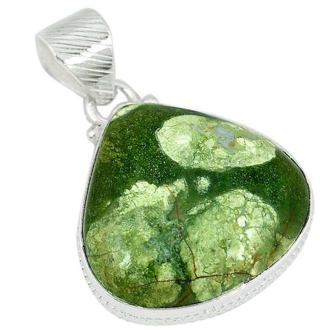 Dije jaspe paisaje verde. El trabajo de montaje de las piedras se hace con cuidado y detalle en el taller para que luzcan su esplendor.