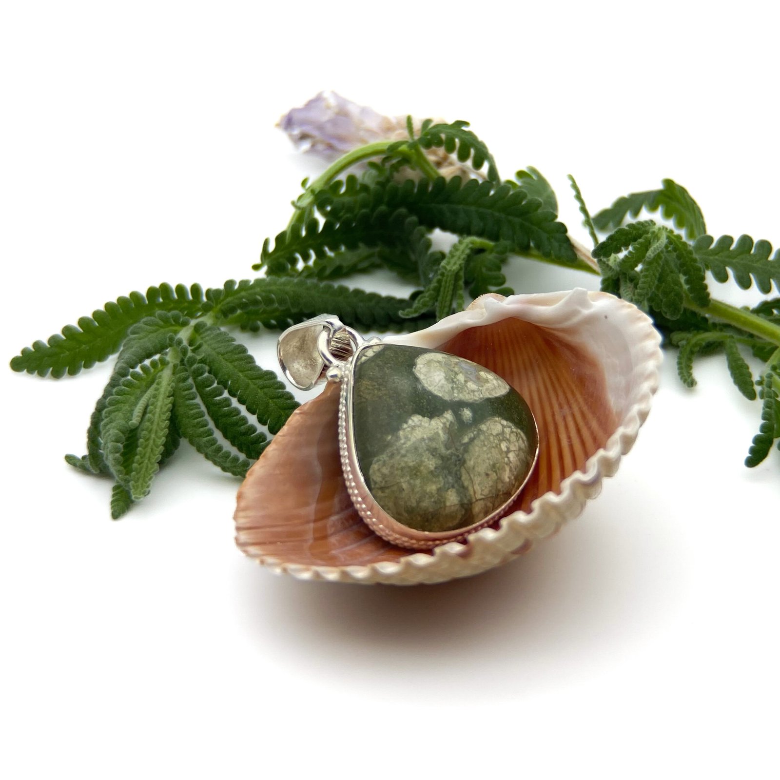 El cuarzo jaspe recrea bellos paisajes dentro de sus formas y colores, tal como se puede apreciar en este dije.