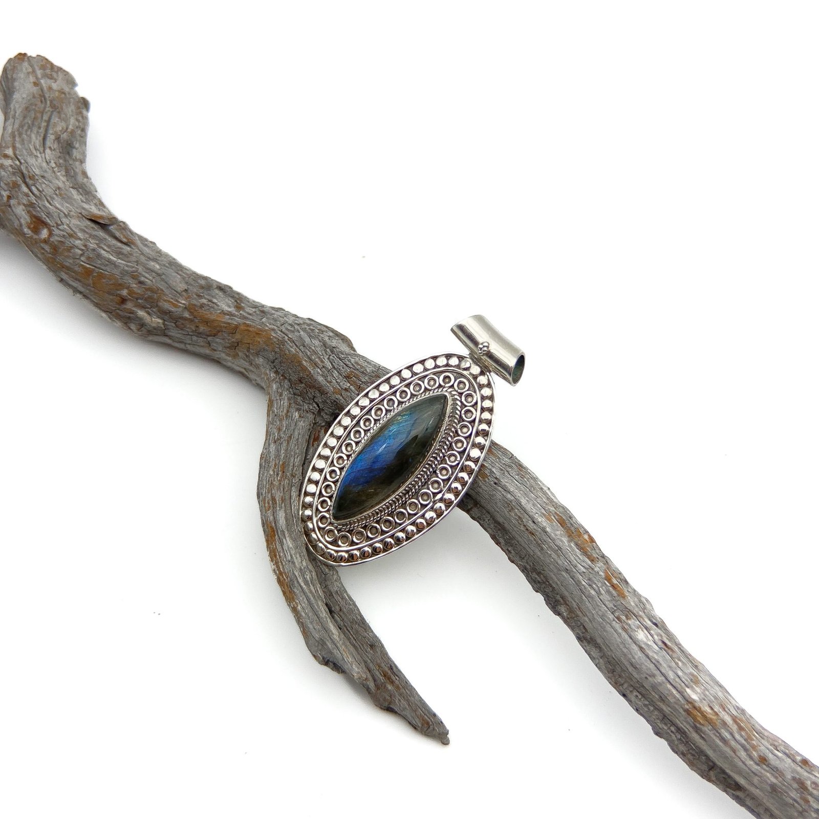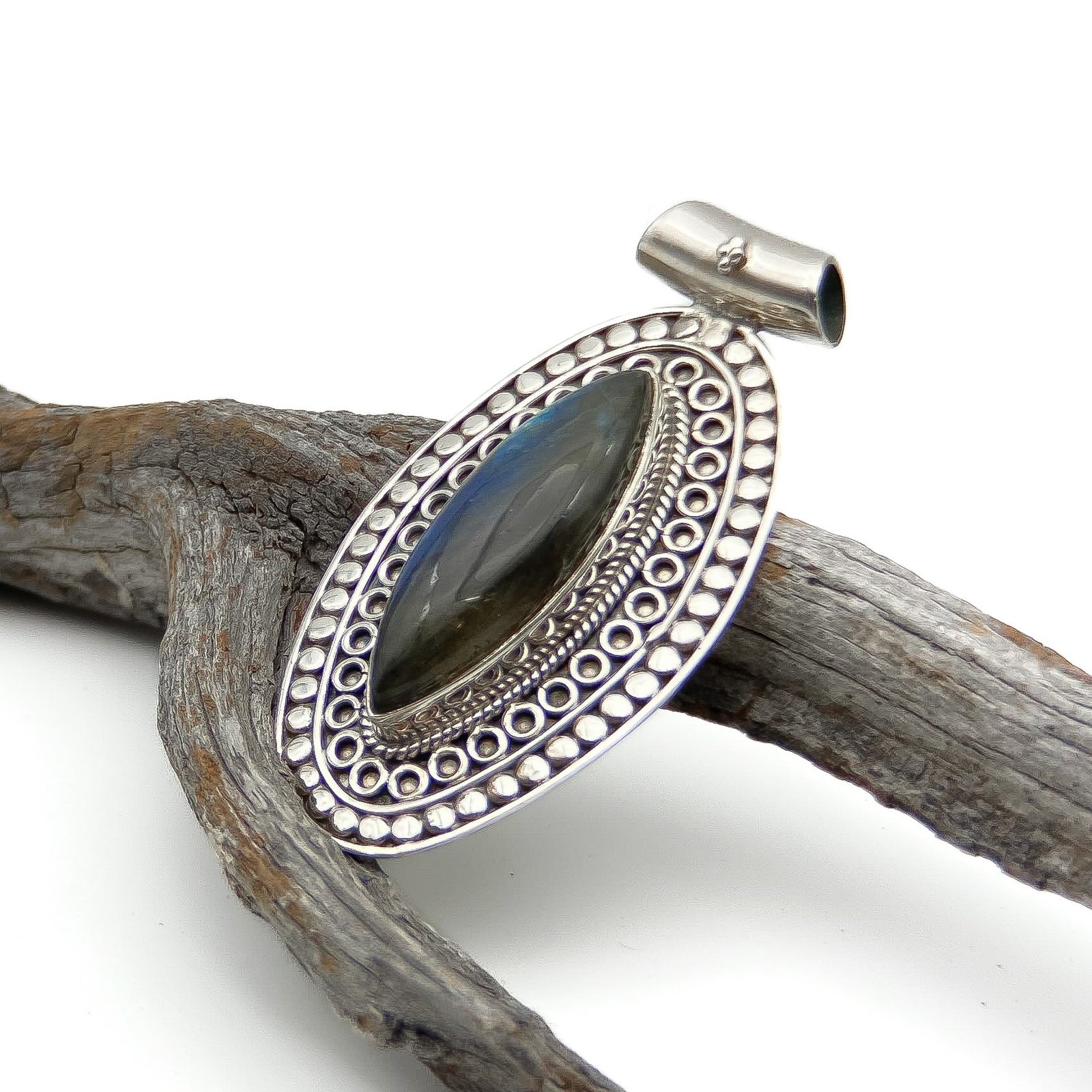 Dije Labradorita Marquis. El trabajo de montaje de las piedras se hace con cuidado y detalle en el taller para que luzcan su esplendor.