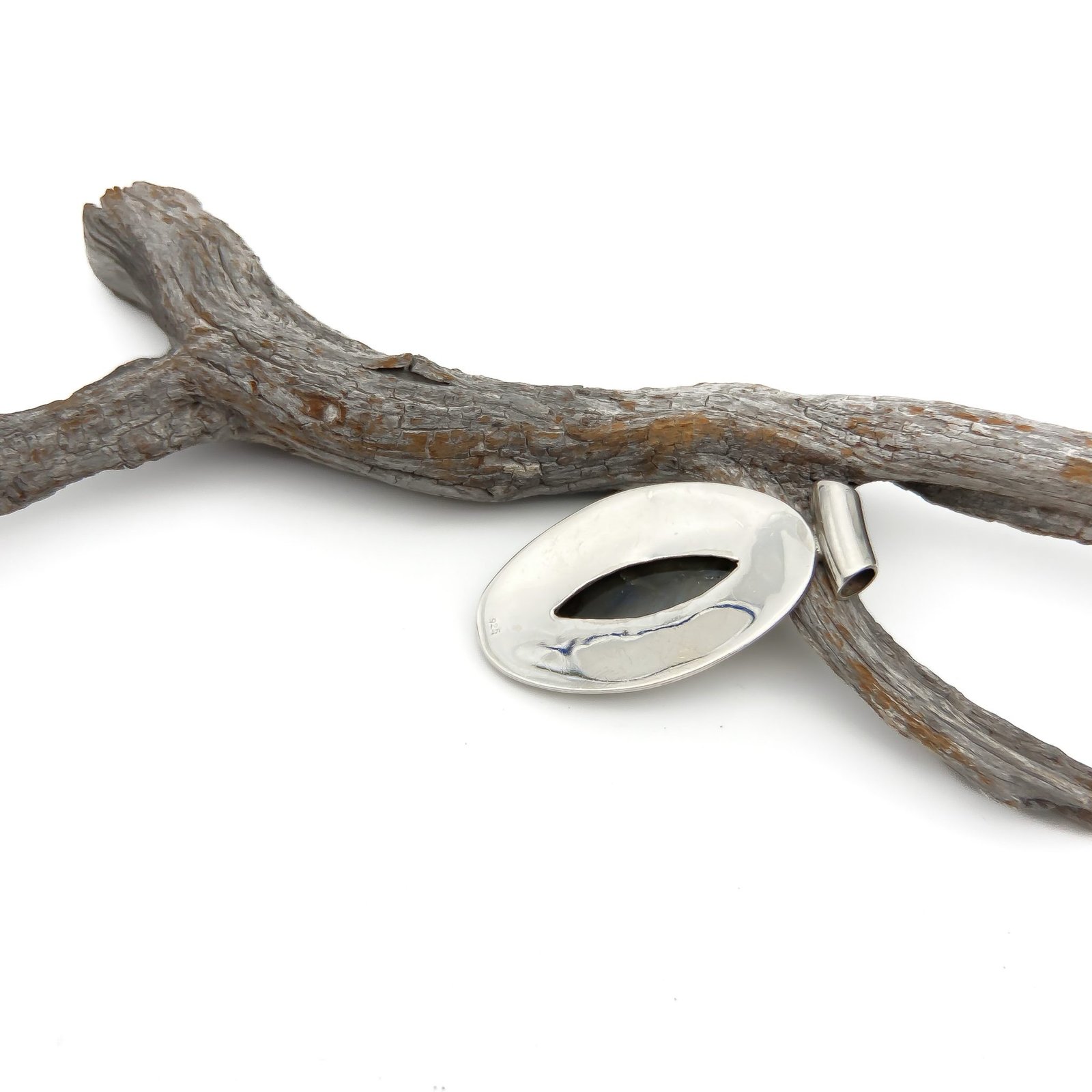 Dije de labradorita, mineral que se caracteriza por presentar a simple vista el espectacular fenómeno de la iridiscencia; posee gran dureza y brillo.