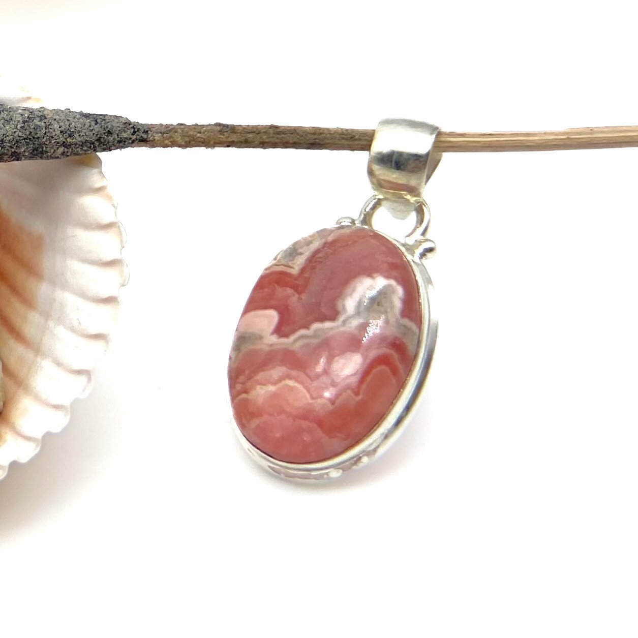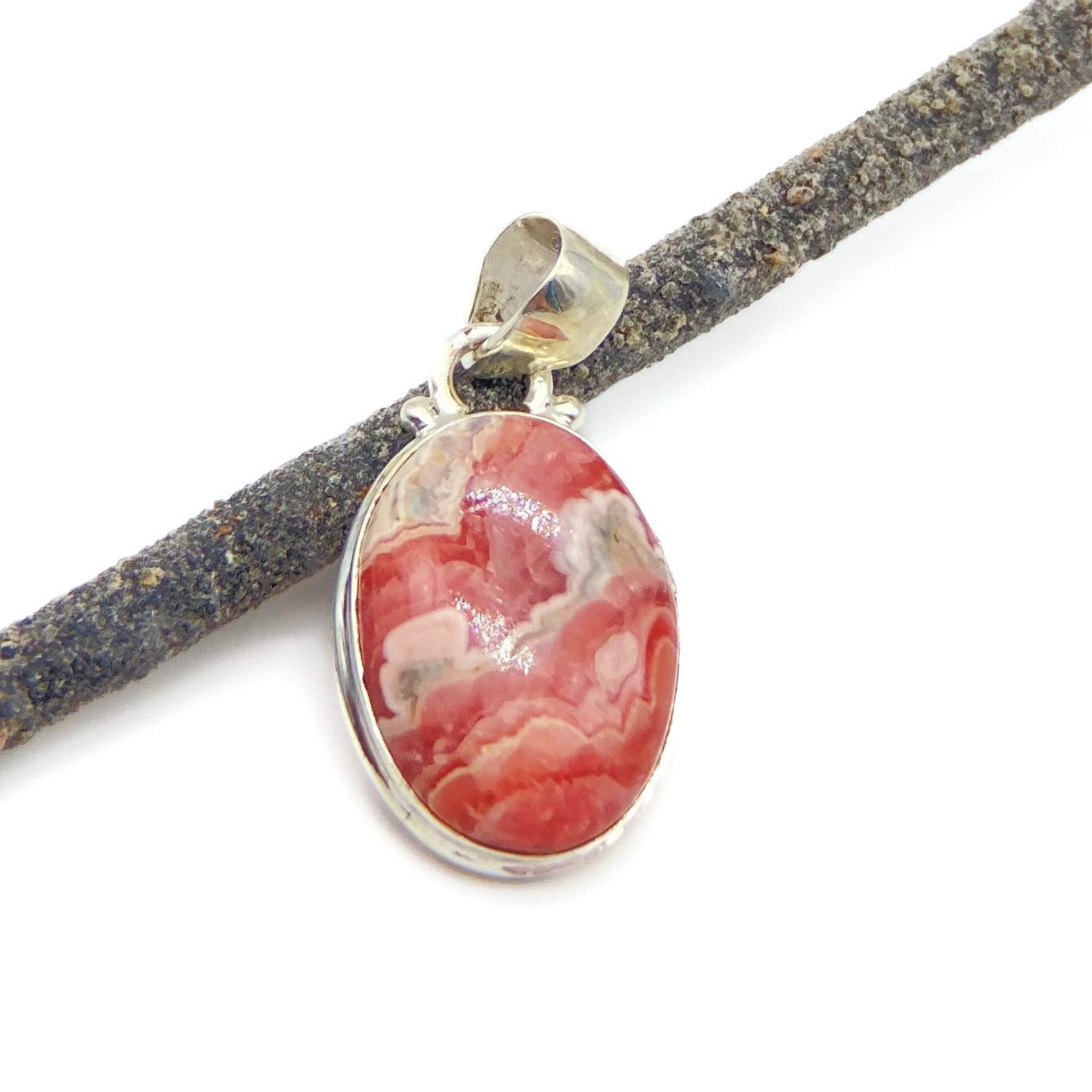 Dije con Rodocosita. El trabajo de montaje de las piedras se hace con cuidado y detalle en el taller para que luzcan su esplendor.