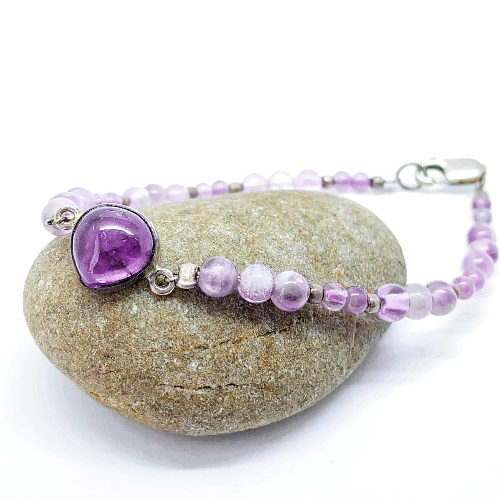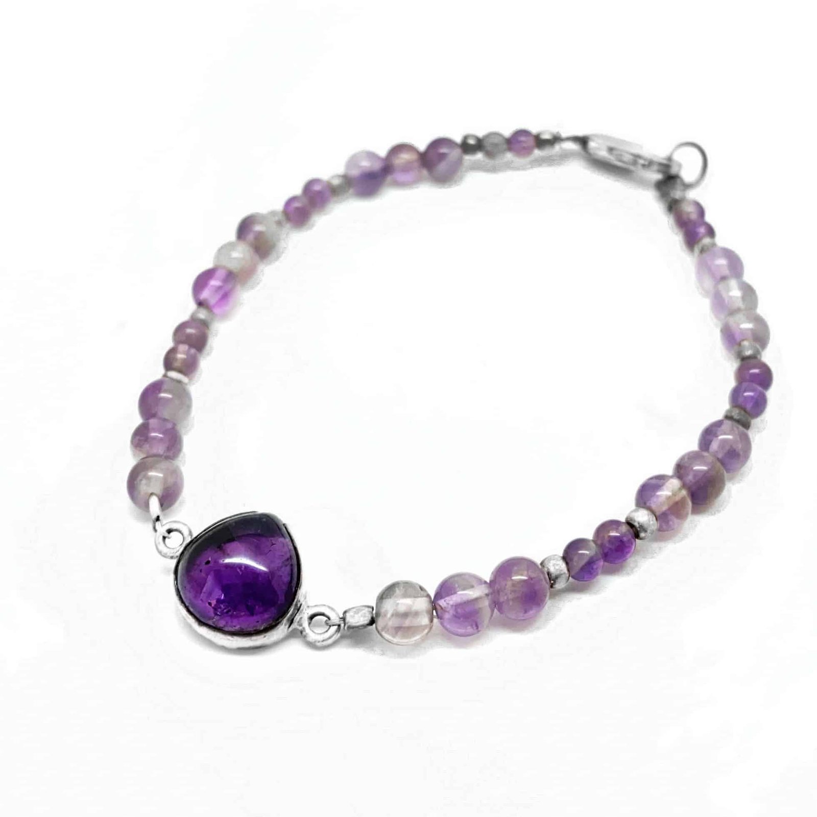 Pulsera que muestra la riqueza y variedad de las tonalidades púrpura del cuarzo amatista, muy popular como talismán y amuleto.