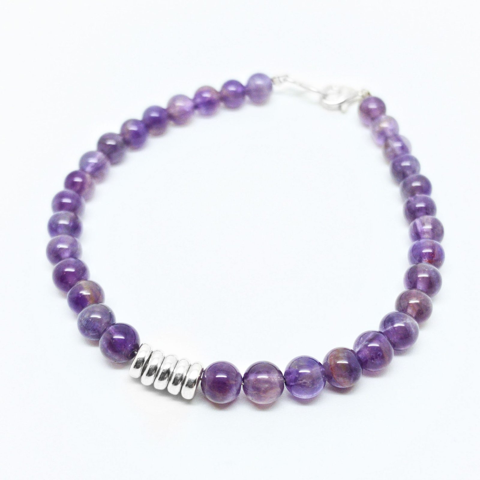 La amatista es un mineral de origen magmático perteneciente a la familia de los cuarzos, la cual hace una mancuerna perfecta con las elegantes cuentas de plata en esta pulsera.