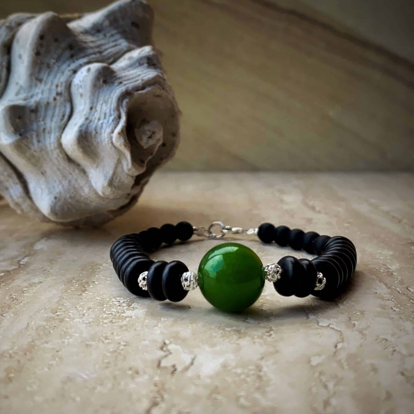 Pulsera de ónix, tipo de cuarzo que puede presentar hermosas franjas de colores contrastados, o bien, profundas tonalidades uniformes; por otra parte, la venturina es otra variedad de cuarzo bastante llamativa y exótica; y, para unir estos dos elementos, no hay como la belleza y elegancia de la plata.
