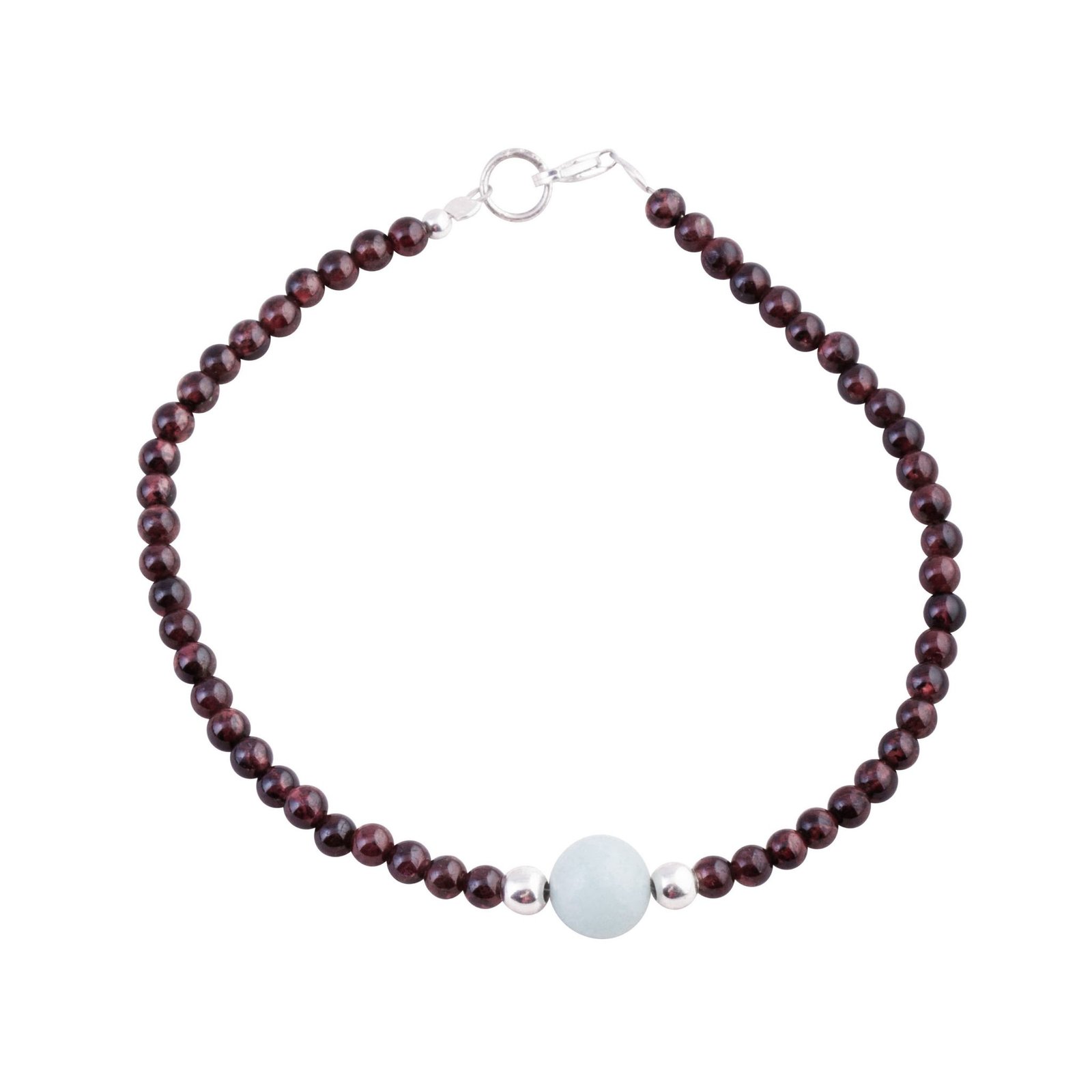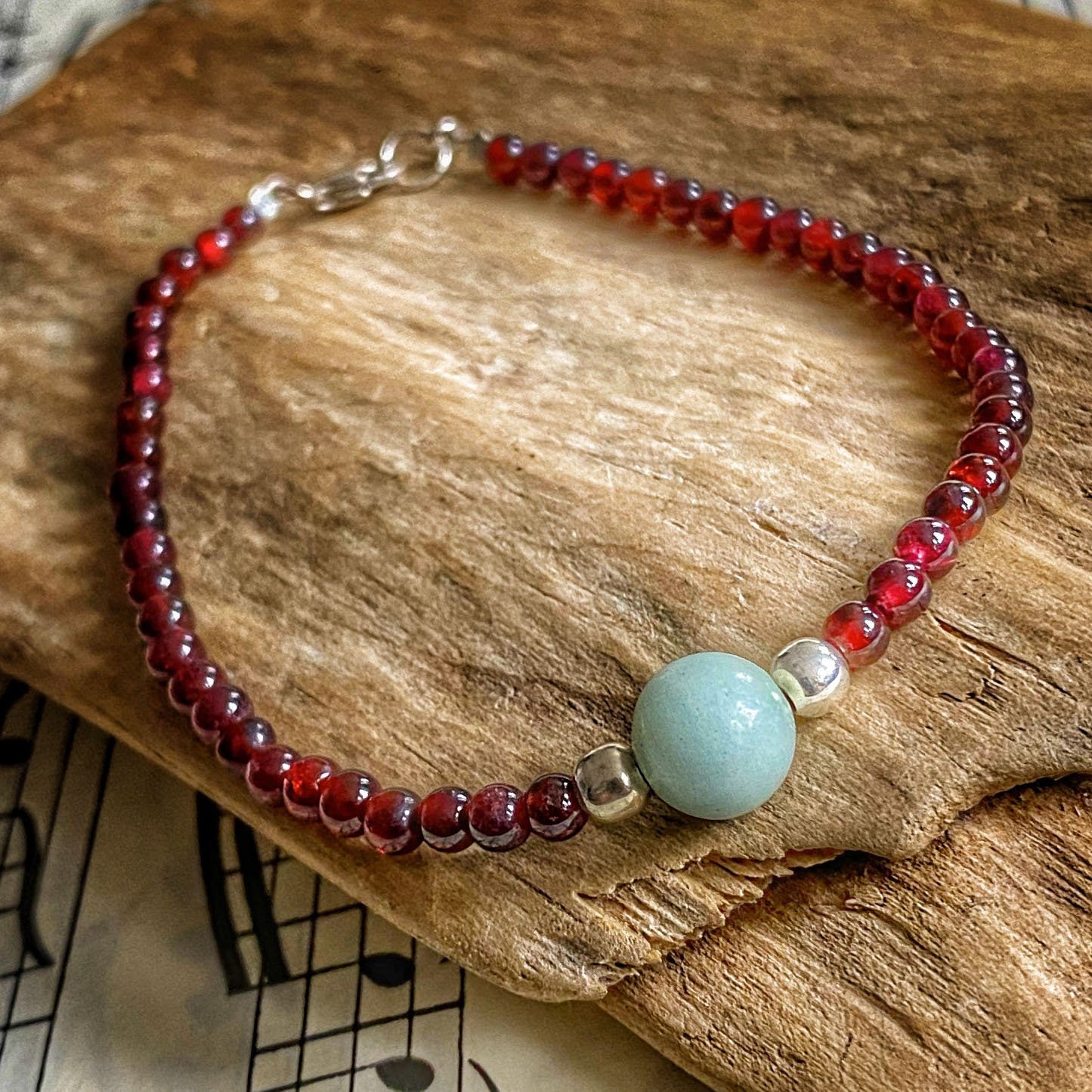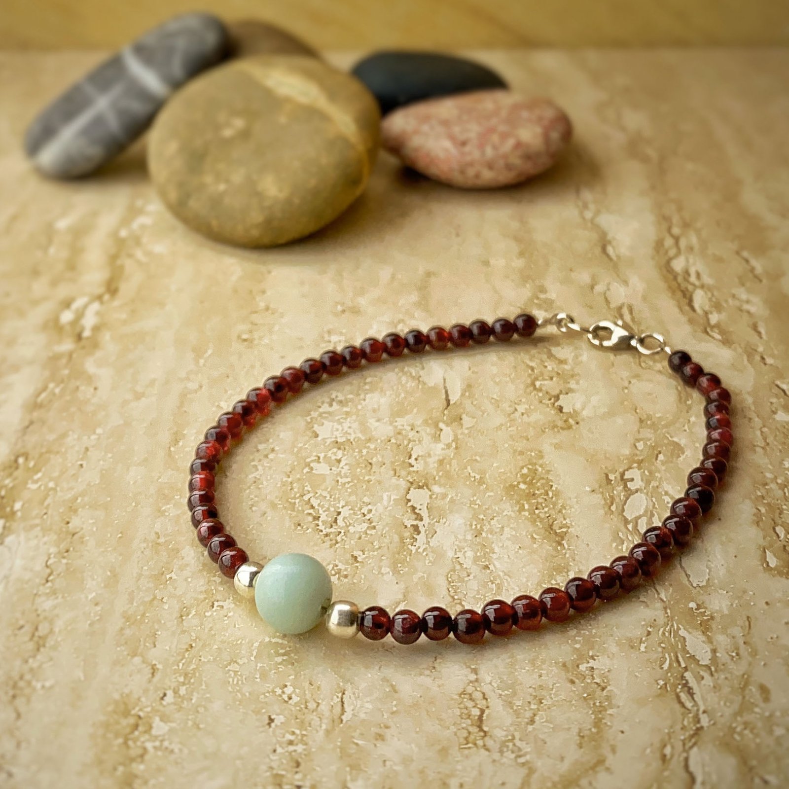 Pulsera Granate y Amazonita. Elaborada de manera artesanal en nuestro taller. Las piedras naturales se montan con cuidado para que luzcan todo su esplendor.