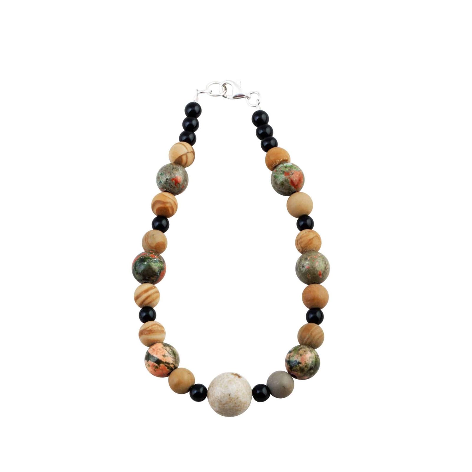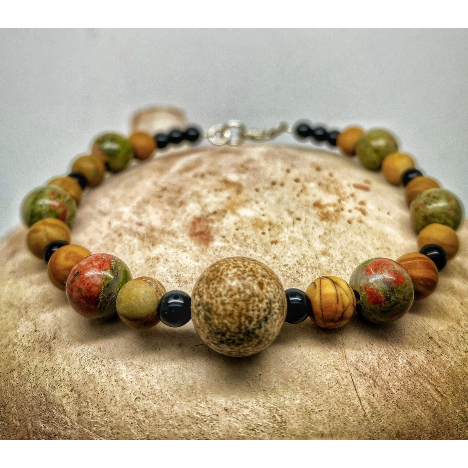 Pulsera Jaspe y Ónix. Elaborada de manera artesanal en nuestro taller. Las piedras naturales se montan con cuidado para que luzcan todo su esplendor.