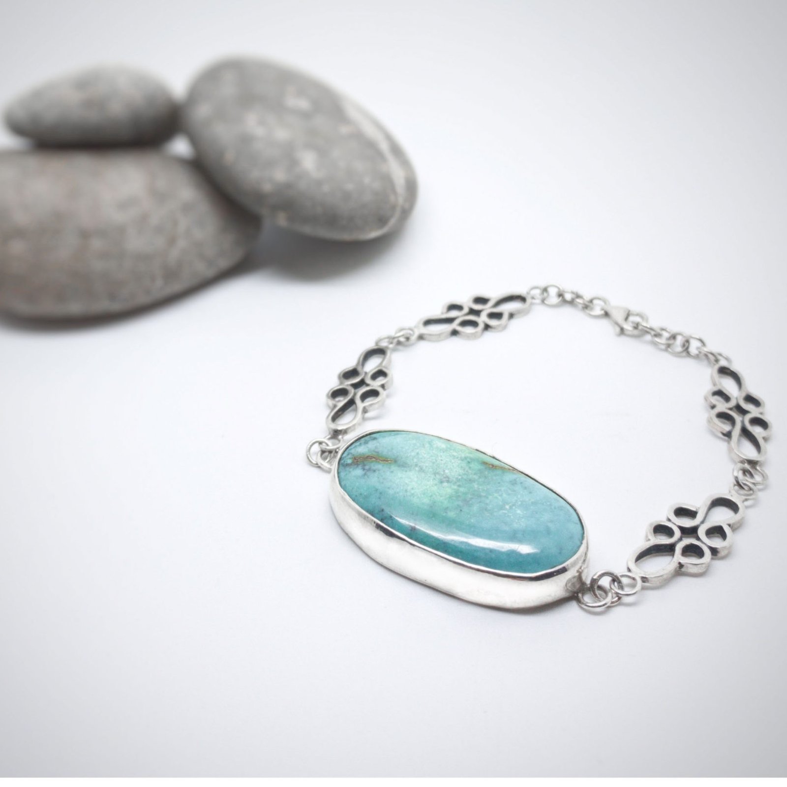 Pulsera Plata y Turquesa Montada, elaborada de manera artesanal en nuestro taller. Las piedras naturales se montan con cuidado para que luzcan todo su esplendor.