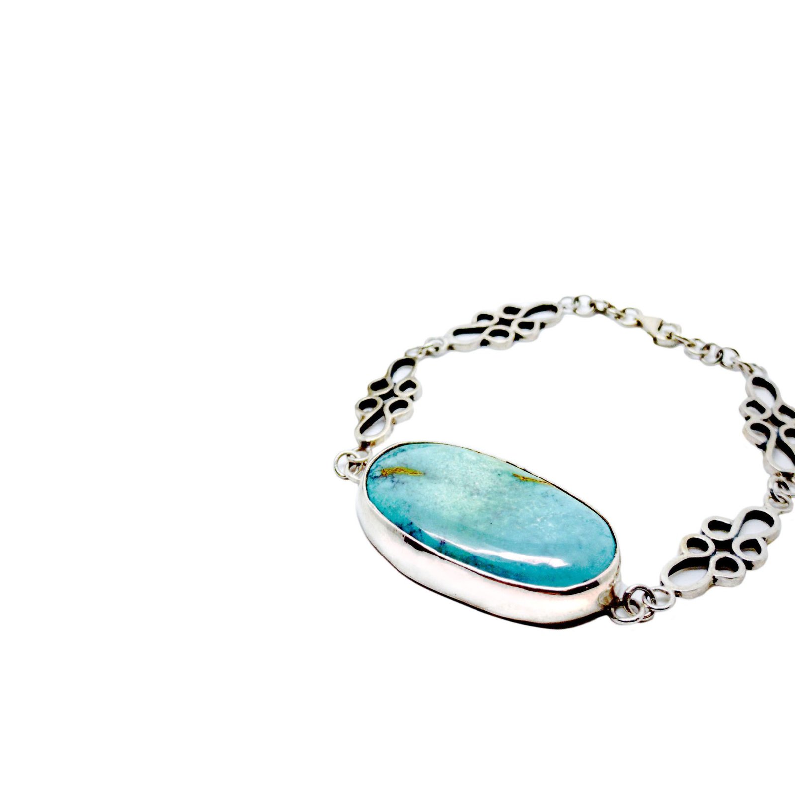 Esta pulsera combina la elegancia y sutileza de la plata con la turquesa, considerada una piedra preciosa opaca de gran valor, muy usada en rituales y como talismán.