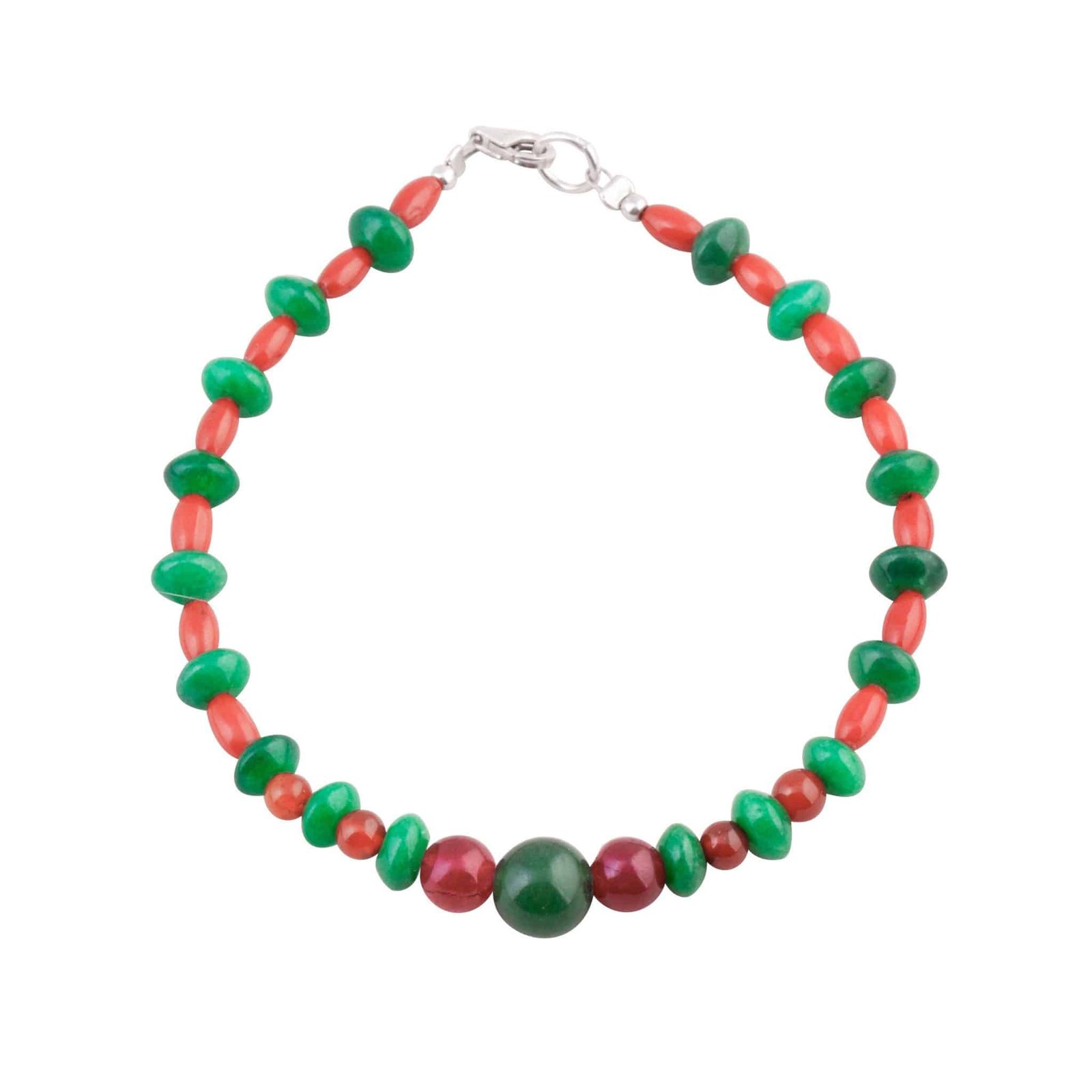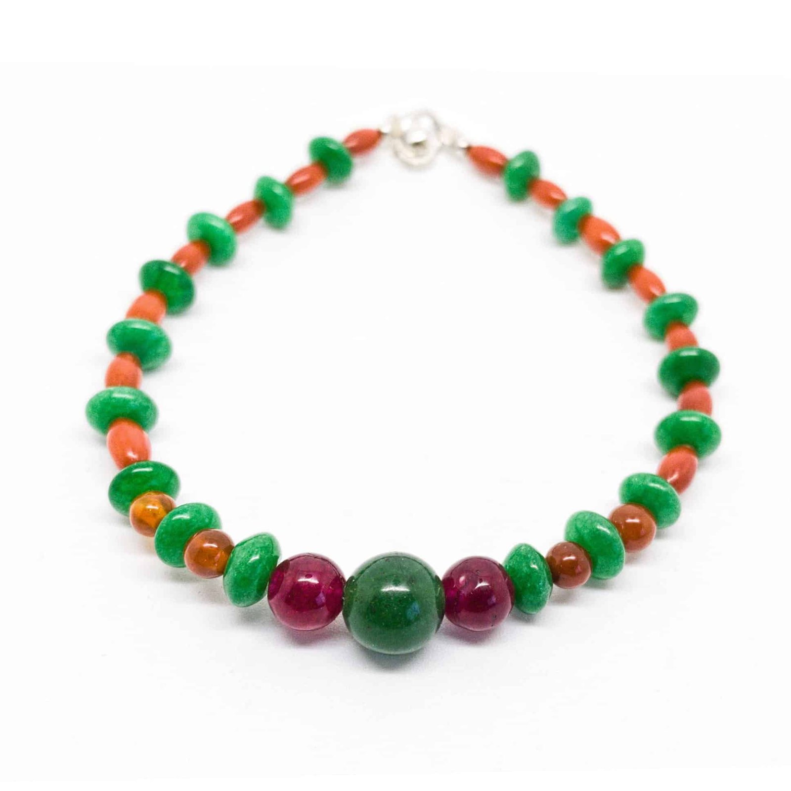 Pulsera que nos recuerda la belleza peligrosa de una serpiente coralillo, pues reúne vibrantes colores como los rojos y naranjas de la cornalina y el coral, así como el verde brillante de la venturina.