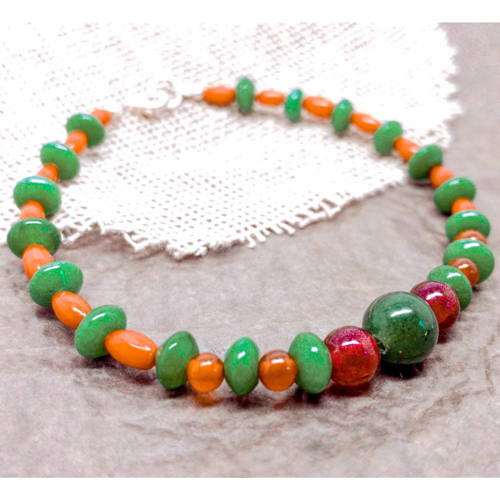 Pulsera Serpiente de Jungla: cornalina, coral y venturina. Elaborada de manera artesanal en nuestro taller. Las piedras naturales se montan con cuidado para que luzcan todo su esplendor.
